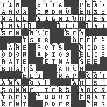 ACROSS 1. Metal container 4. Singer James 8. Lightbulb-shaped fruit 12. Small Philippine buffalo 14. U. of Maine site 16. Celtic language 17. Promenade 18. Seigniories (variant) 20. Related on the mother's side 22. Pipe bend 23. Ingest 24. Elected rep. 25. Compass dir. 28. Ocean 30. Russian ruler of old 31. Auction bid 35. "We ___ not amused" (Victoria) 37. Plant holders 40. Travel on or in a vehicle 41. Aroma 42. Goodbye (Sp.) 44. Writer Wiesel 45. Assign a rank or rating to 46. Inactive volcano in Sicily 47. Observe 48. Naughty children 50. Bowlike part 52. Biblical high priest 54. Hit sharply and swiftly 55. Small bed 58. Wet nurse (var.) 61. Order of Saint Francis (abbr.) 63. Originate 65. Wine waiters 70. Curves 71. It may be bright or harebrained 72. World-weariness 73. Part of Q.E.F. 74. Monthly bill 75. River in Europe 76. Big collection agency DOWN 1. Softens 2. Lacking in sense or substance 3. Pitcher Ryan 4. Greek goddess of the dawn 5. Three (prefix) 6. Coat; cloak 7. Singer Murray 8. For each 9. 4th largest of the Great Lakes 10. Toward the sea 11. Remainder 13. The first octave above the treble staff 15. Lubricates 19. Butter sub 21. Followers of ems 26. California wine valley 27. Wear away 29. Anew 30. Cigar-shaped 32. Do some clerical work 33. Singer Brickell 34. To separate or throw off 35. The sixth month of the Jewish calendar 36. Roll call or roster of names 38. Teat (slang) 39. Echolocation 41. Globe 43. "Two Mules for Sister ____" 49. A type of plum 51. Tax preparer (abbr.) 53. Capri or Wight 55. High-altitude cloud 56. Motion picture award 57. Trials 58. SW Saudi Arabia district 59. Method 60. So be it 62. A pale, very dry sherry 64. Actress Charlotte 66. Floor protector 67. Conclusion 68. Regret 69. Title for a knight