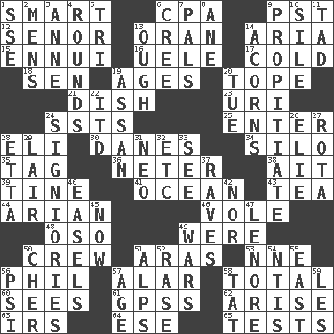 ACROSS 1. Don Adams' spy role 6. Accounting whiz (abbr.) 9. Pacific Standard Time (abbr.) 12. Sir (Sp.) 13. NW Algerian seaport 14. Roberta Peters solo 15. World-weariness 16. Ubangi River tributary 17. Chilled 18. Elected rep. 19. Eons 20. Drink excessively 21. Food container 23. RI univ. 24. Fast planes 25. Keyboard key 28. Biblical high priest 30. Natives or inhabitants of Denmark 34. Grain storage tower 35. Label 36. Distance measurement 38. Small island 39. Prong on a fork 41. Sea 43. Beverage made from leaves 44. Believer in; advocate of (suffix) 46. Short-tailed, large-bodied rat 48. Bear (Spanish) 49. Past tense of be (plural) 50. Ship's personnel 51. Ancient river in northeast Turkey 53. Compass dir. 56. Silvers or Donahue 57. Having or resembling wings 58. Add up to 60. Observes 61. Global Positioning Systems (abbr.) 62. Originate 63. Big collection agency 64. Compass dir. 65. Trials DOWN 1. Compass dir. 2. Not women's 3. Queen of England 1702-14 4. Periods in a boxing match 5. Three (prefix) 6. Algonquian 7. Friends 8. One (Scot) 9. Appease 10. Drop; flow; fall 11. Small boy 13. Ending for "Through" and "Enough" 14. Oak nuts 19. Indian state 20. Third day of the wk. 22. It would 24. Seigniories (variant) 26. Writer Wiesel 27. Roll call or roster of names 28. Singer James 29. Den 31. Modern: prefix 32. And so on (abbr.) 33. Observe 37. All-night dance parties 40. Artist's stands 42. Not either 45. At this time 47. Poe poem 49. Armed conflicts 50. "Mermaids" star 51. High mountains 52. Raze (variant) 54. Nuclear Threat Initiatives 55. Compass direction 56. 23rd letter of the Greek alphabet 57. Personal question 58. Make lace 59. French article