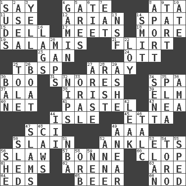 ACROSS 1. Declare 4. Yard entry 8. "One Day ___ Time" 11. Purpose 12. Believer in; advocate of (suffix) 14. Argument over a trivial matter 15. Small valley 17. Confronts 18. Greater amount 19. Deli grouping 21. Talk or behave amorously 23. Separate the seeds from cotton 24. Baseball player Mel 25. Cook's measure (abbr.) 27. Like ___ of sunshine 30. Sometimes accompanies a hiss 31. Sounds asleep 34. Health resort 37. Insect wing 38. From or relating to Ireland 39. Shade tree 40. Fish or hair follower 41. Soft color 43. Teachers' org. 44. Small island 45. Singer James 47. _-fi 49. Auto club (abbr.) 50. Killed 52. Short socks 56. Cole _ (cabbage dish) 57. Child's nurse 60. Hoof sound 61. Is hesitant and indecisive 62. Sports stadium 63. "We ___ not amused" (Victoria) 64. Begley and Asner 65. Fermented drink made from hops 66. Dreamland DOWN 1. Beer foam 2. At sea 3. Shout 4. Street urchin 5. Ancient Greek god of war 6. Neckwear 7. Consume 8. To the left, to Queeg 9. Small pie 10. Had dinner 13. Science/research agcy. 14. Stricken, poetically 16. Fails to keep up a pace 20. Atlas contents 22. Myrna of the movies 25. Lacquered or enameled metalware 26. Water vessel 27. Ascend 28. Respite 29. American tennis player Robert 30. Bar 32. Cuts off 33. Spoken 34. Posted 35. Entreaty 36. Nanny (var.) 42. Path through which fluid escapes 44. One more than two 46. Baby powder 47. Criticizes harshly 48. Crow sounds 49. Approach 50. Downhill vehicle 51. Basketball assoc. 52. Singer Murray 53. Flair 54. "Corrida" creature 55. Hurried 56. A female animal or person 58. Globe 59. Born