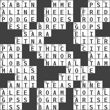 ACROSS 1. Unit of acoustic absorption 6. Madame (abbr.) 9. 23rd letter of the Greek alphabet 12. Place in a line 13. Person who is morally reprehensible 14. Flintstone 15. Porridge 16. Lyric poems 17. Printing process, for short 18. Compass dir. 19. Cy Young winner Saberhagen 20. Republicans 21. "Two Mules for Sister ____" 23. Biblical high priest 24. Inactive volcano in Sicily 25. 61 cubic inches 28. Writing tablet 30. Moral principle 34. Quote 35. Cuckoo 36. Sir (Sp.) 38. _ moment's notice (2 wds.) 39. Tennis shots 41. Relating to or accompanying birth 43. Scottish cap 44. Promenades 46. Short-tailed, large-bodied rat 48. Ewer handle 49. Wig 50. Opposed to 51. Beverages made from leaves 53. Compass dir. 56. Toward shelter 57. Wander aimlessly 58. Add up to 60. Global Positioning Systems (abbr.) 61. Legendary monster 62. Ascend 63. Double-curved letter 64. Prohibit 65. Trials DOWN 1. Plant excrement 2. _ vera 3. Auction offers 4. Swallow 5. Born 6. Ancient Persian 7. Rendezvous 8. Raised railways 9. Appease 10. Arranges properly for use 11. Wedding promise 13. Israeli folk dance 14. Romp 19. Naughty children 20. Set 22. One (Scot) 24. The property of being fit to eat 26. Singer James 27. 480, 500 or 516 sheets of paper 28. Inside of hand 29. Small Philippine buffalo 31. Layer 32. _ tizzy (2 wds.) 33. Small bed 37. All-night dance parties 40. Chalkboards 42. Car dealer's back yard 45. Indian title of respect (Mr.) 47. Poe poem 49. Not wild 50. High mountains 51. Ancient Roman robe 52. Merit 54. Nuclear Threat Initiatives 55. Compass direction 56. Mature 57. Director Reiner 58. Make lace 59. French article