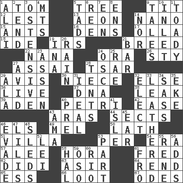 ACROSS 1. Smallest unit of an element 5. Family _ (genealogy) 9. Teat (slang) 12. For fear that 13. Age 14. Billionth: prefix 15. Pismires 16. Lairs 17. Rounded earthenware pot or jar 18. Binary compound 19. Big collection agency 21. A special lineage 22. Nanny 24. Mouth or opening 26. Filthy place 27. Slender Brazilian palm 28. Russian ruler of old 29. Opinion 30. Sibling's daughter 32. Otherwise 36. Moving, as bait 37. Heredity factor (abbr.) 38. Path through which fluid escapes 39. Arabian gulf 40. _ dish (used to culture cells) 42. Relaxation 43. Caspian sea tributary 44. Religious groups 46. Raised railways 49. Cartoonist voice _ Blanc 50. Thin strip of wood or metal 51. Country estate 53. For each 54. Epoch 57. Toward shelter 58. Israeli folk dance 61. Flintstone 62. "You Light Up My Life" star Conn 63. SW Saudi Arabia district 64. Tear apart 65. Curvy letter 66. Spoils 67. Lyric poems DOWN 1. Jai ____ 2. Be inclined (to) 3. Clearly or manifestly demonstrative 4. Mountains (abbr.) 5. Small amounts or degrees 6. Portuguese money of account (variant) 7. Age 8. Followers of ems 9. Lies 10. An arm off of a larger body of water 11. Sycophant 14. Or not 19. _ tizzy (2 wds.) 20. Precipitation 21. Soap unit 23. NE Netherlands city 24. Motion picture award 25. Actress Charlotte 27. Enthusiastic 28. Portable shelters 29. In the manner of 31. Perfect 32. Choose 33. Tough but pliablecoriaceous 34. Backtalk 35. Supplement with great effort 40. Before (prefix) 41. Capri or Wight 43. Housemaid (var.) 45. Ewer handle 46. Elude 47. Ms. Damita and namesakes 48. Bobsleighs 52. Flowery wreath 53. Component 55. French philosopher Descartes 56. Sums up 58. Actor Linden 59. Bear (Spanish) 60. _ de Janeiro 61. Back