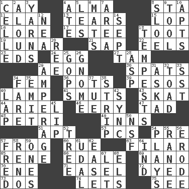 ACROSS 1. Island 4. _ mater 8. R.R. building 11. Flair 13. Rends 15. Trim (branches) 16. Old wives' tales, e.g. 17. First name in cosmetics 18. A blast of a horn 19. Type of eclipse 21. Plant excrement 22. Snakelike fish 23. Begley and Asner 24. Oval reproductive body of a fowl 27. Scottish cap 29. A really long time 30. Arguments over trivial matters 34. Opposite of masc. 36. Plant holders 39. Mexican monetary units 40. Desk light 41. Particles of soot 43. Three-handed card game 44. Satellite of Uranus 46. Suggestive of the supernatural 47. Small amount or degree 48. _ dish (used to culture cells) 49. Lodging establishments 51. Fitting 53. Personal Computers (abbr.) 54. Before (prefix) 57. Tree-dwelling hopper 60. Regret 63. Having threads 65. French philosopher Descartes 66. Peak District village in England 69. Billionth: prefix 70. Compass dir. 71. Artist's stand 72. Colored 73. Two (Sp.) 74. Allows 75. Observe DOWN 1. Cell (Danish) 2. Verbally 3. Tall tales 4. Had dinner 5. French article 6. Floor coverings 7. Type of rug 8. _ gin 9. Implement 10. Flats, for short 12. Teachers' org. 14. Back-to-school mo. 18. Storms 20. To separate or throw off 25. Republicans 26. Dwarf 28. Cleo's killer 29. Electrical Measurement 31. "____ silly question..." 32. Frog relative 33. Fast jet (abbr.) 34. Conductor's collection 35. Give off 37. Third day of the wk. 38. Empty completely 40. Pet locale 42. Synchronize (abbr.) 45. Mouth edge 50. Science/research agcy. 52. Relationship diagram 54. Live dramatic performances 55. Indian princess (variant) 56. Wear away 57. Flintstone 58. Western Nevada city 59. Washington bills 61. Hereditary estate 62. Comfort 64. Working for oneself (abbr.) 67. Allow 68. Raised railways
