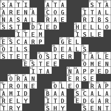 ACROSS 1. Suttee (variant) 5. "One Day ___ Time" 8. R.R. building 11. Sports stadium 13. Gear tooth 14. Slanted text style (abbr.) 15. Rhinal 16. Actress Charlotte 17. Teases 18. Fast jet (abbr.) 19. Passed on 21. Phone greeting 22. A whole individual unit 24. Small island 25. Fortification 27. Set 29. Lubricates 30. Allots cards 32. Proofreading order 33. Flexible twig of a willow tree 35. Falsehood 39. First name in cosmetics 41. Presage 42. Call ___ day 43. Slept 45. NW Algerian seaport 48. Celtic language 49. Heavy duty weighing machine 50. Margarine 52. Reproach for some lapse or misdeed 55. Among 56. Sound made by sheep 57. Any of the three canals of the cochlea 59. Depend 60. It would 61. _ Allan Poe 62. Attempt to accomplish something 63. Like a shrinking violet 64. Posted DOWN 1. Without 2. Caspian sea tributary 3. A testis 4. _ tizzy (2 wds.) 5. Measure of real estate 6. Frog relative 7. Mature 8. Free of sound 9. Eating place 10. In addition 12. Tree or shrub in the Birch family 14. Angers 20. Mischievous child 21. Land elevation 23. Clothes sense 25. Greek goddess of the dawn 26. Be seated 27. Unit of force equal to gravity 28. Ewer handle 30. Pass on 31. Obstructs or blocks passage 33. Baseball player Mel 34. Ocean 36. Electrical Measurement 37. Area sheltered from the wind 38. Conclusion 40. Trig term 43. Born 44. Came up 45. Abalone 46. Turbulent 47. Actor Griffith 49. Small pie 50. Pledge 51. Kenny Rogers chart-topper in '80 53. ____ Jay Lerner 54. Piece 56. Twice 58. Music discs