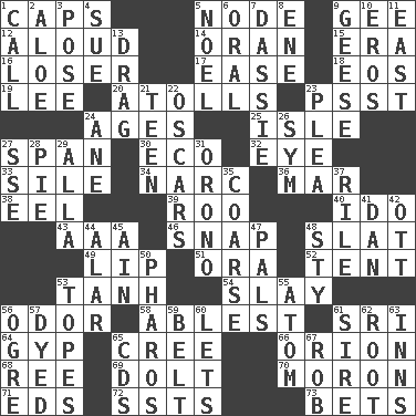 ACROSS 1. Smile enhancers 5. Connecting point 9. Turn to the right 12. Verbally 14. Northwest Algerian city 15. Period 16. Failure 17. Relaxation 18. Greek goddess of the dawn 19. Area sheltered from the wind 20. Ringlike coral islands and reefs 23. Inconspicuous attention getter 24. Eras 25. Small island 27. Connect, as a bridge 30. Environmental prefix 32. Sight organ 33. Drop; flow; fall 34. Drug cop 36. Make imperfect 38. Snakelike fish 39. Friend of Pooh 40. Wedding promise 43. Auto club (abbr.) 46. Fastener 48. Narrow board 49. Mouth edge 51. Mouth or opening 52. Portable shelter 53. Hyperbolic tangent 54. Kill 56. Scent 58. Most capable 61. Indian title of respect (Mr.) 64. Flimflam 65. Algonquian 66. Greek mythologigal hunter 68. To separate or throw off 69. Stupid person 70. Person of subnormal intelligence 71. Begley and Asner 72. Fast planes 73. Stakes DOWN 1. Give a ring to 2. Medicinal plant 3. Airs 4. Institute legal proceedings 5. Christmas carol 6. Spoken 7. Hyrax 8. Compass dir. 9. Honkers 10. Greek god of love 11. Compass direction 13. To trail on the ground 21. Adolescent 22. Motion picture awards 23. Entreaty 24. One (Scot) 26. Symbol (abbr.) 27. Compass dir. 28. Sliced dessert 29. Silent film actress Nazimova 31. U. of Maine site 35. Unrefined 37. Cause heat under the collar 41. Daniel's nick name 42. Baseball player Mel 44. Having or resembling wings 45. The 18th letter of the Arabic alphabet 47. Friends 48. Filthy place 50. N Egypt peninsula 53. Drinks excessively 55. Smallest unit of an element 56. Legendary monster 57. Colored 59. Waist strap 60. Allows 61. Title for a man of rank and authority 62. Carrot, for example 63. Taverns 65. Music discs 67. Director Reiner