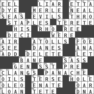 ACROSS 1. Snakelike fish 4. One who doesn't tell the truth 8. Singer James 12. Color 13. Haggard of country music 14. Anneal 15. Oceans 17. Vices 18. Through, poetically 19. Paper fasteners 21. Cylindrical with tapered ends 23. Part of HMS, perhaps 24. 17th letter of the Greek alphabet 26. Portuguese money of account (variant) 27. Tenth: prefix 28. We are 30. Wind 31. Ringlike coral islands and reefs 34. Enemy 37. Perceive with the eye 38. Natives or inhabitants of Denmark 39. Santa ___, CA 40. Increase 41. Keyboard key 42. Allow 43. Object of repulsion 44. Backtalk 46. Commissioned mil. rank 47. Fast jet (abbr.) 50. Before (prefix) 51. Rings like a ship's bell 54. Flamboyance 57. Lubricates 58. Laconic 60. Opening into or through something 62. Margarine 63. Maternal 64. Boat paddle 65. Grant temporary use of 66. False hair 67. Heredity factor (abbr.) DOWN 1. Begley and Asner 2. Snake ____ (dice throw) 3. Tough but pliablecoriaceous 4. Prying instrument 5. From or relating to Ireland 6. 100% 7. Remainder 8. Main course 9. Giggle 10. Small pie 11. Medicinal plant 13. Cartoonist voice _ Blanc 16. Ketch in the Levant 20. Air pressure measure (abbr.) 22. Blunders 25. A small or young owl 27. Passed on 29. Otherwise 30. White ___ sheet 31. An important port of Yemen 32. Stories 33. Single 34. It jiggles the polygraph 35. Singles 36. Consume 41. Mild oath, euphamism for damn 43. Gillaume's butler role 44. Health resort 45. Bowlike part 46. An organ shaped like a helmet 48. Small fatty European fish 49. Clothes sense 51. Calm and collected 52. _ and Stitch 53. Proofreading order 55. Born 56. Liveliness 59. Compass dir. 61. Period