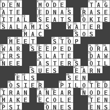 ACROSS 1. Lair 4. Method 8. Label 11. Had dinner 12. Ferber et al. 14. To erase 15. Slanted text style (abbr.) 17. Theater features 18. Migrant worker of the '30s 19. Deli grouping 21. Wetness 23. Big _ 24. Distress signal 25. Confront 27. Cease 30. Armed conflict 31. Oozed 34. Mouth or opening 37. Big collection agency 38. Schedule 39. Obsolete 40. Born 41. Michaelmas daisies 43. Petroleum 44. Institutes legal proceedings 45. Merit 47. Raised railways 49. Elected rep. 50. Flexible twig of a willow tree 52. Manned the helm 56. SW Asia republic 57. Approach 60. Connecting point 61. Create 62. Learning spot: Fr. 63. Nine, plus one 64. 23rd letter of the Greek alphabet 65. Singles 66. Followers of ems DOWN 1. Raised platform 2. Singer James 3. Be tempered by heat 4. Mesonic 5. Lyric poems 6. Heredity factor (abbr.) 7. Ingest 8. Receives possession of 9. SW Saudi Arabia district 10. Unit of force equal to gravity 13. Compass dir. 14. Printing process, for short 16. Unable to walk 20. Floor protectors 22. Viper 25. Female horse 26. Celtic language 27. Arguments over trivial matters 28. False hair 29. River in Europe 30. Acquire through effort 32. Son of Isaac 33. Otherwise 34. Scent 35. Water falling in drops from the sky 36. Leather borer 42. Stitch closed the eyes of (a falcon) 44. Compass dir. 46. Soon (poet.) 47. 1973 Nobel Price Winner (Physics) Leo 48. Actor's bit 49. Fathers 50. Mouths or openings 51. Actress Charlotte 52. Diluted with white 53. Lug 54. Genesis locale 55. Lairs 56. Naughty child 58. Non-commissioned officer (abbr.) 59. A really long time