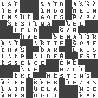 ACROSS 1. Purpose 4. Alleged 8. "____ silly question..." 12. Afternoon social gathering 13. _ china 14. Count _ (2 wds.) 15. Follow as a consequence or result 18. Travels 19. Dad 20. French poetic form 22. Set 23. Grant temporary use of 24. Slender fish 25. Actress Charlotte 26. Elected representative 30. Large container 33. Nick name for Arthur 36. Went 37. Mouths or openings 39. Boat paddle 40. Supplements with great effort 41. Desk light 42. Tree or shrub in the Birch family 44. Eastern Standard Time (abbr.) 45. Center 47. She-sheep 50. One (Scot) 51. Indonesian resort city 53. Make supply last 54. Snuggling 57. 43,560 square feet 59. Fermented drink made from hops 61. Pulls into pieces 63. Den 64. Southern CA. univ. 65. Born 66. Ancient Greek god of war 67. Dunce 68. Sight organ DOWN 1. Shoshoni 2. Elected reps. 3. Artist's stand 4. Signal 5. Small Philippine buffalo 6. Binary compound 7. Two (Sp.) 8. Electrical Measurement 9. Lick closed 10. Sleep 11. Santa ___, CA 16. One who makes use of a thing 17. Inactive volcano in Sicily 21. The main thing one is thinking about 22. Separate the seeds from cotton 24. Unit of force equal to gravity 26. Male parent of an animal 27. Puff or smoke 28. Washington bills 29. Remainder 30. Short-tailed, large-bodied rat 31. Ancient river in northeast Turkey 32. Scottish caps 34. Hero or heavy, e.g. 35. Bit 38. Orators 42. Adept person 43. Confederate soldiers (slang) 46. Compass dir. 48. Electrical Unit 49. Writer Wiesel 52. Silly 53. 4th largest of the Great Lakes 54. 1994 drama film starring Jodie Foster 55. Part of Q.E.F. 56. Jennifer or Joel 57. Chicken ___ king 58. Auto 59. Partially opened flower 60. Environmental prefix 62. Observe