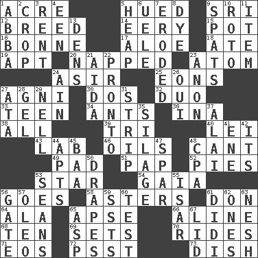 ACROSS 1. Land measure 5. Took on color 9. Indian title of respect (Mr.) 12. A special lineage 14. Suggestive of the supernatural 15. Cooking vessel 16. Maid-servant 17. _ vera 18. Had dinner 19. Fitting 20. Slept 23. Smallest unit of an element 24. SW Saudi Arabia district 25. Immeasurably long periods of time 27. Hindu god of fire 30. Two (Sp.) 32. Superhero pair 33. Adolescent 34. Pismires 36. _ tizzy (2 wds.) 38. 100% 39. Three (prefix) 40. Flowery wreath 43. Experiment locale 46. Petroleums 48. Patter 49. Writing tablet 51. Infant food 52. Sliced desserts 53. Play the lead 54. Greek goddess of the earth (variant) 56. Leaves 58. Michaelmas daisies 61. Spanish title 64. Wing 65. Domed church section 66. Place in a line 68. Nine, plus one 69. Arranges properly for use 70. Amusement-park features 71. Greek goddess of the dawn 72. Inconspicuous attention getter 73. Food container DOWN 1. Swedish rock group 2. Riding implement 3. Monthly bill 4. Car or cant ending 5. Pile 6. Ubangi River tributary 7. Worn away 8. Color 9. Arguments over trivial matters 10. Printing process, for short 11. A distinct part 13. Habitations of wild animals 21. Opera by Verdi 22. Right away 23. Soon (poet.) 24. The 18th letter of the Arabic alphabet 26. Fr. "Yes" 27. "One Day ___ Time" 28. Set 29. 1994 drama film starring Jodie Foster 31. Long narrow piece of something 35. Fodder prepared in a silo 37. Jai ____ 41. Compass dir. 42. ___ a Wonderful Life 44. Tenement units (abbr.) 45. Sound made by sheep 47. Practice fight 48. Accounting whiz (abbr.) 50. Window treatments 53. Seines 55. Austrian river, tributary to the Danube 56. Yard entry 57. Butter sub 59. Fast planes 60. Trial 61. "You Light Up My Life" star Conn 62. Singles 63. Soft 65. Viper 67. Hat (slang)