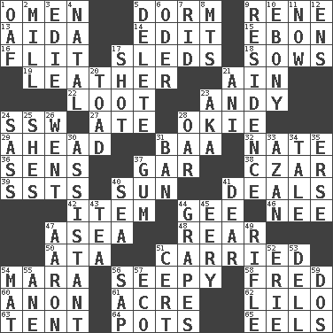 ACROSS 1. Sign of things to come 5. Dormintory (informal) 9. French philosopher Descartes 13. Opera by Verdi 14. Prepare for publication 15. Inky black, to poets 16. Sudden quick movement 17. Bobsleighs 18. Sty mamas 19. Cordwainer's material 21. The 18th letter of the Arabic alphabet 22. Spoils 23. "60 Minutes" Commentator Rooney 24. Compass dir. 27. Had dinner 28. Migrant worker of the '30s 29. Forward in time 31. Sound made by sheep 32. Nathan's nickname 36. Elected reps. 37. Slender fish 38. Russian ruler of old 39. Fast planes 40. Player for Phoenix 41. Allots cards 42. A distinct part 44. Unit of force equal to gravity 46. Born 47. At sea 48. Tail end 50. _ moment's notice (2 wds.) 51. Borne 54. Hindu Mythology: god of death 56. Not well drained, as in land 58. Flintstone 60. Soon (poet.) 61. Land measure 62. _ and Stitch 63. Portable shelter 64. Cooking vessels 65. Snakelike fish DOWN 1. Clumsy lout 2. Place where flour is made 3. Singer Brickell 4. Brizilian seaport 5. Erase 6. Baltic tributary 7. To free from 8. Mountains (abbr.) 9. Home 10. Dark wood 11. At this time 12. Followers of ems 17. Went for two points 20. Frog relative 21. Cuckoo 23. Alias (abbr.) 24. Backtalk 25. "______ My Girl" (Turtles hit) 26. Gone 28. Boat paddle 30. Aide 31. Bar 33. Muslim summons to prayer 34. Lie 35. Celtic language 37. Chewing product 40. Ocean 41. Letter starter 43. Afternoon social gathering 44. Wine fruits 45. Suggestive of the supernatural 47. Composer Copland 49. Firearm 51. Foregone conclusion 52. One of the Great Lakes 53. Small valley 54. Floor covering 55. One (Scot) 56. Plant excrement 57. Environmental prefix 59. Two (Sp.)