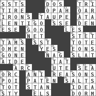 ACROSS 1. Fast planes 5. Two (Sp.) 8. Three (prefix) 11. Hoop that covers a wheel 12. Brightly colored fish 14. Rowing implement 15. Metal shackles 17. Grayish beige 18. _ moment's notice (2 wds.) 19. Small, flat, pigmented spot on the skin 21. Compass dir. 22. Lair 23. Compass dir. 24. Thick or sticky substance 25. French article 27. Fish or hair follower 28. Proofreading order 31. Scottish caps 35. Fast jet (abbr.) 37. Haul 38. Presage 39. Affirmative reply 41. Immeasurably long periods of time 42. Went 43. Tired old horse 45. Narrow board 46. Assistant 47. Make lace 49. Curve 51. Shoshoni 52. Ocean 55. The grampus (Milton) 57. Black tropical American cuckoo 60. Thinks logically 62. Luau course 63. Eucharist need 65. Table seasonings 66. Small child 67. Comedian Laurel of Laurel & Hardy 68. The content of cognition 69. Filthy place 70. Raised railways 71. Dormintory (informal) DOWN 1. Vertical member of a panel or frame 2. Male parents of animals 3. Heavy duty weighing machine 4. Emitted 5. ___ good deed 6. Musical composition 7. Plant excrements 8. Inedible or poisonous agaric 9. Assign a rank or rating to 10. SW Asia republic 13. The bottom of a shoe or boot 16. Public display of a written message 17. A girl or young woman (variant) 20. Moves 26. _____ Park, CO 29. Inactive volcano in Sicily 30. Trial 31. Ancient Roman robe 32. Mine, in Marseilles 33. Ananias' fault 34. Scornful expression 36. "___ Little Indians" 40. Titan orbits this 44. Yard entry 48. Afternoon social gatherings 50. Smile enhancers 52. Twentieth part of a lira 53. Keyboard key 54. Indian state 55. Chooses 56. Carrot, for example 58. Nathan's nickname 59. Slanted text style (abbr.) 61. Stated 64. Followers of ems