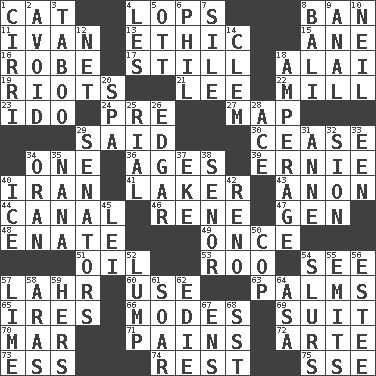 ACROSS 1. Feline 4. Chops off 8. Bar 11. "Terrible" tsar 13. Principle of right and wrong 15. One (Scot) 16. Loose flowing garment 17. Free from disturbance or agitation 18. Mountain range southwest of Kyrgyzstan 19. Disturbances 21. Area sheltered from the wind 22. Place where flour is made 23. Wedding promise 24. Before (prefix) 27. Atlas unit 29. Expressed in words 30. Stop 34. Single 36. Matures 39. Bert's buddy 40. SW Asia republic 41. Member of a famous L.A. basketball team 43. Soon (poet.) 44. Lessep's creation 46. French philosopher Descartes 47. Commissioned military rank (abbr.) 48. Maternal 49. At one time in the past 51. Lubricate 53. Friend of Pooh 54. Observe 57. Cowardly lion portrayer 60. Purpose 63. Insides of hands 65. Angers 66. Methods 69. Costume for a special activity 70. Third mo. 71. Aches 72. Johnson of "Laugh-In" 73. Double-curved letter 74. Remainder 75. Compass dir. DOWN 1. High-altitude cloud 2. Shun 3. Off limits 4. French article 5. Baseball player Mel 6. Silvers or Donahue 7. Filth; sediment 8. Indonesian resort city 9. Of or related to the anus 10. Famous astronaut Armstrong 12. Fish or hair follower 14. Clement's nick name 18. Electrical Measurement 20. Health resort 25. Monetary unit of Yemen 26. _ Allan Poe 28. Adept person 29. Legislators 31. Queen of England 1702-14 32. The Jewish people; Israel 33. Car or cant ending 34. NW Algerian seaport 35. Grandmother 37. Supplement with great effort 38. Sir (Sp.) 40. Frozen water 42. Western Nevada city 45. Flowery wreath 50. Police officer (slang) 52. Mass 54. Plays smoothly or legato 55. Gives off 56. First name in cosmetics 57. Welles in "The Third Man" 58. Ancient river in northeast Turkey 59. Possessive pronoun 61. Fly high 62. Singer Brickell 64. White ___ sheet 67. Followers of ems 68. Fast jet (abbr.)