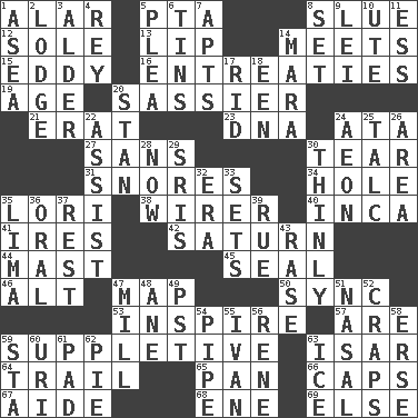 ACROSS 1. Having or resembling wings 5. Parent Teacher Assoc. 8. Turn sharply 12. Flatfish 13. Mouth edge 14. Confronts 15. Whirlpool 16. Pleas 19. Mature 20. More lively and spirited 21. Part of Q.E.F. 23. Heredity factor (abbr.) 24. _ moment's notice (2 wds.) 27. Without 30. Separate forcefully 31. Sounds asleep 34. Hollow 35. Australian parrot (variant) 38. One who wires 40. South American Indian 41. Angers 42. Titan orbits this 44. Vertical spar for supporting sails 45. Lick closed 46. Keyboard modifier key 47. Atlas unit 50. Synchronize (abbr.) 53. Stimulate to action 57. "We ___ not amused" (Victoria) 59. Supplementary 63. Austrian river, tributary to the Danube 64. Lag or linger behind 65. Baking dish 66. Smile enhancers 67. Assistant 68. Compass dir. 69. Otherwise DOWN 1. Toward the sea 2. Inn 3. Tree or shrub in the Birch family 4. Marina Del _, California 5. Entreaty 6. Canisters 7. Tenement units (abbr.) 8. Arrange properly for use 9. Luau accessory 10. Shoshoni 11. Curvy letter 14. Hindu Mythology: god of death 17. To free from 18. Car or cant ending 20. Comedian Laurel of Laurel & Hardy 22. Aid 24. Age 25. Baby powder 26. Length times width 28. At this time 29. Indian titles of respect 30. Without viscosity 32. Epoch 33. Puts into a specified state 35. Pale green bean 36. Relating to the mouth 37. Respite 39. Regret 43. Raze (variant) 47. Place where flour is made 48. One (Scot) 49. Pacific Standard Time (abbr.) 51. Relating to the nose 52. Dice game 54. Corncob 55. _ the terrible 56. French philosopher Descartes 58. Celtic language 59. R.R. building 60. RI univ. 61. Groovy apt. 62. Sliced dessert 63. Frozen water