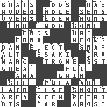ACROSS 1. Naughty children 6. Two (Sp.) 9. Actress Charlotte 12. Cowboy competition 13. Opening into or through something 14. Elected reps. 15. Baking chambers 16. Paradise 17. Religious women 18. Conclude 19. Inside; within (prefix) 20. Went 21. Conclusions 23. RI univ. 24. Pulitzer Prize-winning author Ferber 25. Catcalls? 28. Daniel's nick name 30. Choose 34. Fastener 35. The first octave above the treble staff 36. 1973 Nobel Price Winner (Physics) Leo 38. Retirement account (abbr.) 39. Drug cop 41. Marketplace scale 43. Fast jet (abbr.) 44. Relatively large 46. Sudden quick movement 48. Wet nurse (var.) 49. Broad smile 50. Proofreading order 51. Monetary unit of Botswana 53. "We ___ not amused" (Victoria) 56. Den 57. Otherwise 58. Derisive sound 60. Length times width 61. Peachy ____! 62. _ dish (used to culture cells) 63. Twice 64. Ewer handle 65. Came up DOWN 1. Sis' sibling 2. Be footloose 3. An important port of Yemen 4. Watched over 5. Mayday 6. Texas town _ City 7. Butter sub 8. Elected rep. 9. One who advocates reunion 10. Queen of England 1702-14 11. Double-curved letter 13. Coop moms 14. Sounds asleep 19. Peak District village in England 20. Chewing product 22. Compass dir. 24. Pleas 26. Armed conflicts 27. Argument over a trivial matter 28. Mild oath, euphamism for damn 29. Having or resembling wings 31. Eastern Standard Time (abbr.) 32. 4-wheeled motor vehicle 33. Ring climax 37. Kind of red light 40. Device for capturing images 42. Connecticut Ivy Leaguer 45. Make lace 47. Sillier 49. Small, secluded valley 50. Indian skirt 51. Entreaty 52. One who makes use of a thing 54. Printing process, for short 55. Blunders 56. Experiment locale 57. Supplement with great effort 58. Health resort 59. Standoff