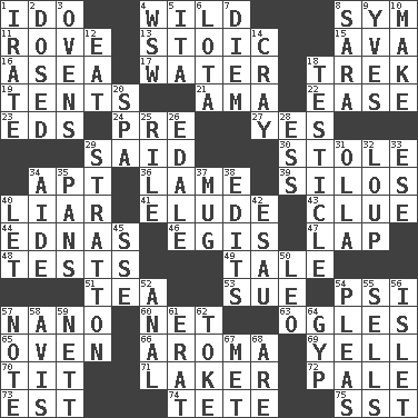 ACROSS 1. Wedding promise 4. Uncontrolled 8. Symbol (abbr.) 11. Be footloose 13. Unemotional 15. Actress Gardner 16. At sea 17. Wetness 18. Long journey 19. Portable shelters 21. Housemaid (var.) 22. Comfort 23. Begley and Asner 24. Before (prefix) 27. Consenting reply 29. Stated 30. Fur scarf 34. Fitting 36. Unable to walk 39. Grain storage towers 40. One who doesn't tell the truth 41. Dodge 43. A slight indication 44. Ferber et al. 46. Armor plate that protects the chest 47. Pet locale 48. Trials 49. Lie 51. Afternoon social gathering 53. Institute legal proceedings 54. 23rd letter of the Greek alphabet 57. Billionth: prefix 60. Fish or hair follower 63. Stares at amorously 65. Baking chamber 66. Odor 69. Shout 70. Teat (slang) 71. Member of a famous L.A. basketball team 72. Diluted with white 73. Eastern Standard Time (abbr.) 74. Wig 75. Fast jet (abbr.) DOWN 1. Feeling or showing extreme anger 2. Administered medicine 3. Baking chambers 4. Compass dir. 5. Call ___ day 6. Globular water bottle used in Asia 7. South Vietnam president (1954) 8. "Two Mules for Sister ____" 9. Jacques Cousteau's middle name 10. Cause to be 12. Consume 14. Supercomputer manufacturer 18. One of the two male reproductive glands 20. Health resort 25. Cause heat under the collar 26. Peak District village in England 28. Double-curved letter 29. Ski resort town in Vermont 31. Water jar 32. Central Nebraska county 33. Compass dir. 34. Helper 35. Zero-star reviews 37. Large cup 38. Proofreads 40. Allow 42. Son of Isaac 45. Compass dir. 50. Lion 52. Of or related to the anus 54. Entreaties 55. Exchanges for money 56. Small island 57. Short letter 58. Opinion 59. Remaining after all deductions 61. Part of Q.E.F. 62. Puff or smoke 64. Con 67. Was introduced to 68. "We ___ not amused" (Victoria)