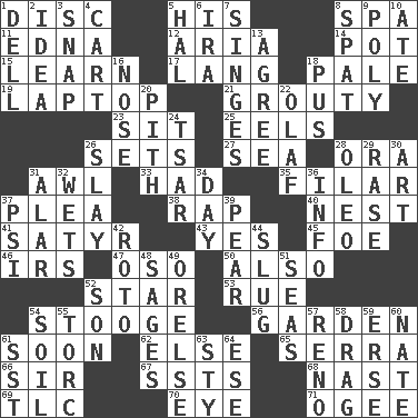ACROSS 1. Flat circle 5. Part of HMS, perhaps 8. Health resort 11. Pulitzer Prize-winning author Ferber 12. Roberta Peters solo 14. Cooking vessel 15. Memorize 17. Austrian-born American filmmaker Fritz 18. Diluted with white 19. Portable computer 21. Cross 23. Be seated 25. Snakelike fish 26. Puts into a specified state 27. Ocean 28. Mouth or opening 31. Leather borer 33. Possessed 35. Of or pertaining to a thread or threads 37. Entreaty 38. Strike 40. Egg locale 41. Letch 43. Consenting reply 45. Enemy 46. Big collection agency 47. Bear (Spanish) 50. In addition 52. Play the lead 53. Sorrow 54. Moe Howard, for one 56. Place where plants grow 61. Within a short period 62. Otherwise 65. Spanish missionary in California 66. Title for a knight 67. Fast planes 68. Political cartoonist Thomas 69. Affectionate concern, for short 70. Sight organ 71. Double curve, resembling the letter S DOWN 1. Small valley 2. It may be bright or harebrained 3. Fastener 4. Draw slowly or heavily 5. Actor Linden 6. Retirement account (abbr.) 7. Burns superficially 8. Argument over a trivial matter 9. Many (prefix) 10. Had dinner 13. Match 16. Characteristic smell of wine 18. Fluid product of inflammation 20. Essential or central part 22. Norwegian king 24. Russian ruler of old 26. Kill 28. Margarine 29. To erase 30. Nonscientific branch of learning 31. Having or resembling wings 32. Soaks 34. 24 hours 36. Information 37. Air pressure measure (abbr.) 39. Lightbulb-shaped fruit 42. Printing process, for short 44. A hard, heavy blow 48. Gurus 49. Threatening words 51. Oceans 52. Manchild 54. Earth 55. Torque (variant) 57. Western Nevada city 58. To be drawn or hauled along 59. Celtic language 60. Nathan's nickname 61. Fast jet (abbr.) 63. Filthy place 64. Compass dir.