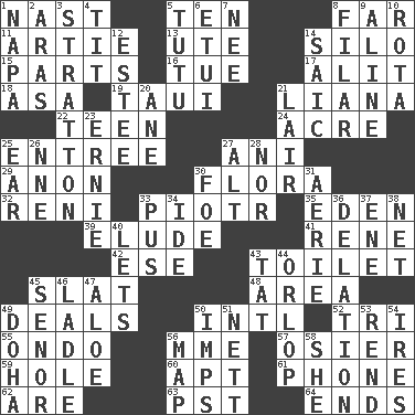ACROSS 1. Political cartoonist Thomas 5. Nine, plus one 8. At a great distance 11. Nick name for Arthur 13. Shoshoni 14. Grain storage tower 15. Components 16. Third day of the wk. 17. Came down and settled, as after flight 18. White ___ sheet 19. "Change" in Tahitian 21. Climbing, woody, usually tropical vines 22. Adolescent 24. 43,560 square feet 25. Main course 27. Cuckoo 29. At once, immediately (arch.) 30. Plants 32. Painter Guido (1575-1642) 33. Peter (Polish) 35. Locale of original sin 39. Dodge 41. French philosopher Descartes 42. Compass dir. 43. Bathroom 45. Narrow board 48. Type of rug 49. Allots cards 50. International (abbr.) 52. Three (prefix) 55. Southwest Nigerian state 56. Madame (abbr.) 57. Flexible twig of a willow tree 59. Opening into or through something 60. Fitting 61. Give a jingle 62. "We ___ not amused" (Victoria) 63. Pacific Standard Time (abbr.) 64. Extremities DOWN 1. California wine valley 2. Caspian sea tributary 3. Ski resort town in Vermont 4. Teat (slang) 5. Ballerina skirt 6. Needle holder 7. Born 8. Having threads 9. Place in a line 10. Roll call or roster of names 12. First name in cosmetics 14. Ketch in the Levant 20. One (Scot) 21. Den 23. Bert's buddy 25. Hearing organ 26. Compass dir. 27. Keyboard modifier key 28. Or not 30. Enemy 31. Nest on high 33. Fluid product of inflammation 34. Binary compound 36. Accusation by an informer 37. Compass dir. 38. Fish or hair follower 40. Allows 43. Make lace 44. Lowest deck of a ship 45. Sir (Sp.) 46. Dipping utensil 47. _ vera 49. Capital of the state of Qatar 50. Naughty children 51. Remaining after all deductions 53. Tear apart 54. Angers 56. Atlas unit 58. A female animal or person