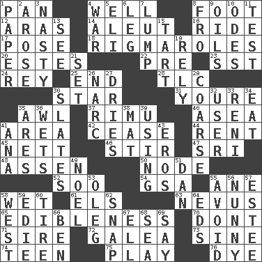ACROSS 1. Baking dish 4. Not ill 8. Lowest support of a structure 12. Caspian sea tributary 14. Native American of Southwest Alaska 16. Travel on an animal 17. Airs 18. Frustrating wastes of time 20. _____ Park, CO 22. Before (prefix) 23. Fast jet (abbr.) 24. Marina Del _, California 25. Conclude 28. Affectionate concern, for short 30. Play the lead 31. You are 35. Leather borer 37. Tall New Zealand timber tree 40. Toward the sea 41. Type of rug 42. Stop 44. Monthly bill 45. Remaining after all deductions 46. Agitate 47. _ Lanka 48. NE Netherlands city 50. Thickened enlargement 52. "Barney Miller" actor Jack 54. Girls' org. (abbr.) 55. One (Scot) 58. Dripping 61. Raised railways 63. Congenital growth or mark on the skin 65. The property of being fit to eat 70. Do not 71. Title for a man of rank and authority 72. An organ shaped like a helmet 73. Trig term 74. Adolescent 75. Romp 76. Color DOWN 1. Some stationery 2. Came up 3. Smutty 4. Armed conflict 5. Connecticut Ivy Leaguer 6. Part of a journey 7. Mass 8. Back 9. Petroleums 10. Lyric poems 11. Trial 13. Observe 15. Small pie 19. Trust 21. Put into a specified state 26. Drug cop 27. Frees from moisture 29. Unrefined 30. Chalkboards 32. One who uses or employs something 33. Painter Guido (1575-1642) 34. Erode 35. Ancient Greek god of war 36. Soaks 38. Floor protector 39. Exploiting 41. Santa ___, CA 43. Greek god of love 49. Christmas carol 51. One of the 12 tribes of Israel 53. Cassini of fashion 55. Prevent from happening 56. Pet term 57. First name in cosmetics 58. Compass direction 59. Singer Brickell 60. Hoop that covers a wheel 62. Fastener 64. Begley and Asner 66. Benjamin's nick name 67. Pipe bend 68. Ocean 69. Declare
