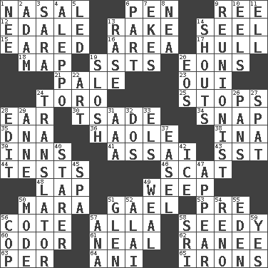 ACROSS 1. Rhinal 6. Writing instrument 9. To riddle 12. Peak District village in England 13. Libertine 14. Sew up the eyelids of hawks and falcons 15. Having ears or earlike features 16. Length times width 17. Frame or body of a ship 18. Atlas unit 19. Fast planes 20. Immeasurably long periods of time 21. Diluted with white 23. Fr. "Yes" 24. "Corrida" creature 25. Discontinues 28. Ewer handle 30. Sadhe (variant) 34. Fastener 35. Heredity factor (abbr.) 36. White Person, in Hawaii 38. _ tizzy (2 wds.) 39. Taverns 41. Slender Brazilian palm 43. Fast jet (abbr.) 44. Trials 46. Leave at once 48. Pet locale 49. Shed a tear 50. Hindu Mythology: god of death 51. Highlander 53. Before (prefix) 56. ____ d'Azur (French Riviera) 57. Silent film actress Nazimova 58. Shabby and untidy 60. Scent 61. Anneal 62. Indian princess (variant) 63. For each 64. Cuckoo 65. Metal shackles DOWN 1. Born 2. First man 3. "Two Mules for Sister ____" 4. City in Syria 5. Directed 6. Role in a play 7. Makes supply last 8. Teachers' org. 9. One who advocates reunion 10. Snakelike fish 11. Pipe bend 13. To erase 14. Yells 19. Agitate, as a liquid 20. Greek goddess of the dawn 22. Tate display 24. Interpreter 26. Baking dishes 27. Petty quarrel 28. Prepare for publication 29. Singer Murray 31. American Automobile Association (abbr.) 32. Two (Sp.) 33. Raised railways 37. Artist's stand 40. A viewer who gazes fixedly 42. Frozen water 45. Health resort 47. Become visible 49. Welt 50. Method 51. Small, secluded valley 52. Jai _ 54. Former U.S. Attorney General Janet 55. Paradise 56. Police officer (slang) 57. Santa ___, CA 58. Indian title of respect (Mr.) 59. Consenting reply