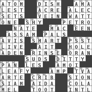 ACROSS 1. Smallest unit of an element 5. Food container 9. Wet nurse (var.) 12. For fear that 13. 1/640 square mile 14. Actor Baldwin 15. Arranges properly for use 16. Distinctive style or manner 17. Electrical Unit 18. Single 19. Like a shrinking violet 21. Stone: prefix 22. Nathan's nickname 24. Apple computer (short form) 26. Car or cant ending 27. Indian state 28. Friends 29. Opinion 30. Don Adams' spy role 32. Inconspicuous attention getter 36. Moving, as bait 37. Small island 38. Hollow 39. An important port of Yemen 40. Remove soap 42. Northwest Algerian city 43. Soap bubbles 44. Simple song 46. Baking dish 49. French article 50. Mine, in Marseilles 51. Like summer trees 53. Electrical Unit 54. Federal power corp. 57. Johnson of "Laugh-In" 58. Baby bed with high sides 61. The Jewish people; Israel 62. Thailand, formerly 63. Opera by Verdi 64. Root beer relative 65. Cartoonist voice _ Blanc 66. A blast of a horn 67. International (abbr.) DOWN 1. In addition 2. Adolescent 3. Clearly or manifestly demonstrative 4. Mountains (abbr.) 5. _ Jones' Locker 6. Frozen water 7. _ Lanka 8. Layer 9. Having winglike extensions 10. Distance measurement (Brit.) 11. NE Massachussets city 14. Deep reverence 19. R.R. building 20. Cloth borders 21. Personal Computers (abbr.) 23. NE Netherlands city 24. Shops 25. The first octave above the treble staff 27. Enthusiastic 28. Aches 29. Wing 31. Women servants 32. Picture 33. Making a chance decision by using lots 34. Kill 35. Nine, plus one 40. Sorrow 41. Dutch treat 43. Insidious 45. Mischievous child 46. Suffix with ecto or cyto 47. Nest on high 48. Relating to or accompanying birth 52. Opposite of masc. 53. Blind as ____ 55. Electrical Unit 56. Of or related to the anus 58. Feline 59. River (Sp.) 60. Wedding promise 61. _-fi