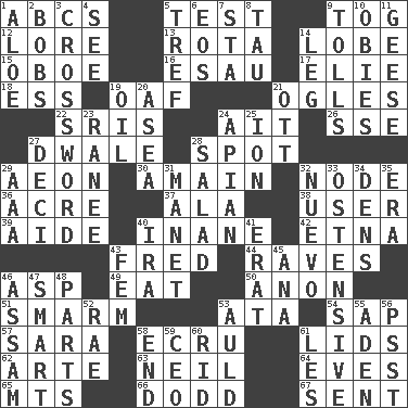 ACROSS 1. Lettered men learn these first 5. Trial 9. Coat; cloak 12. Old wives' tales, e.g. 13. Round or rotation of duties 14. Ear part 15. Mitch Miller's instrument 16. He sold his birthright 17. Writer Wiesel 18. Curvy letter 19. Clumsy lout 21. Stares at amorously 22. Indian titles of respect 24. Small island 26. Compass dir. 27. A sleeping potion; an opiate (poet.) 28. Blemish 29. Period of immesurable duration 30. With great haste 32. Thickened enlargement 36. 43,560 square feet 37. In the manner of 38. One who makes use of a thing 39. Assistant 40. Empty; void 42. Inactive volcano in Sicily 43. Flintstone 44. All-night dance parties 46. Viper 49. Consume 50. Soon (poet.) 51. Excessive but superficial compliments 53. "One Day ___ Time" 54. Plant excrement 57. "Two Mules for Sister ____" 58. Shade of tan 61. Hats (slang) 62. Johnson of "Laugh-In" 63. Famous astronaut Armstrong 64. Nights before holidays 65. Mountains (abbr.) 66. Texas town _ City 67. Emitted DOWN 1. Medicinal plant 2. Moves up and down 3. What you're doing now 4. Observe 5. Unclean, religiously 6. Greek goddess of the dawn 7. R.R. building 8. The 19th letter of the Greek alphabet 9. For Whom the Bell _____ 10. Off-Broadway awards 11. Honkers 14. Part of a journey 19. Lubricate 20. Toward the sea 21. Baseball player Mel 23. Indian princess (variant) 24. Bee-related 25. Electrically charged atom 27. Tenth: prefix 28. First course 29. Auto club (abbr.) 31. French painter Edouard 32. New (sp.) 33. Clearly or manifestly demonstrative 34. Cub Scout units 35. Period 40. Lyricist Gershwin 41. Part of Q.E.F. 43. Opposite of masc. 45. Santa ___, CA 46. Indian state 47. Don Adams' spy role 48. Pieces 52. Actress Charlotte 53. Old (Scot.) 55. Arabian gulf 56. Inconspicuous attention getter 58. Conclude 59. Corporate head (abbr.) 60. To free from 61. French article