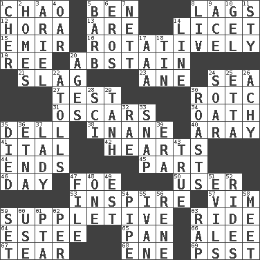 ACROSS 1. US Secretary of Labor Elaine L. _ 5. Benjamin's nick name 8. Straggles 12. Israeli folk dance 13. "We ___ not amused" (Victoria) 14. It is permitted: Lat. 15. Arab leader 16. Rotating or pertaining to rotation 19. To sift 20. Refrain by choice 21. Volcanic refuse 23. A saturated hydrocarbon 24. Ocean 27. Trial 30. College mil. group 31. Motion picture awards 34. Pledge 35. Small valley 38. Lacking in sense or substance 40. Like ___ of sunshine 41. Slanted text style (abbr.) 42. Centers 44. Extremities 45. Component 46. 24 hours 47. Enemy 50. One who uses or employs something 53. Motivate 57. Zeal 59. Supplying deficiencies 63. Travel on or in a vehicle 64. First name in cosmetics 65. Baking dish 66. Toward shelter 67. Separate forcefully 68. Compass dir. 69. Inconspicuous attention getter DOWN 1. "Mermaids" star 2. Residences 3. Satellite of Uranus 4. Boat paddle 5. Sharp remark 6. Greek god of love 7. Remaining after all deductions 8. 54 in ancient Rome 9. Adept person 10. Set 11. Filthy place 14. Actor's bit 17. American Automobile Association (abbr.) 18. Shallow baking pan 20. Eras 22. Ringlike coral islands and reefs 24. Fly high 25. Singer James 26. Painful 28. _-fi 29. Hyperbolic tangent 30. Exposes to great heat 32. Actress Charlotte 33. Fastener 35. Passed on 36. Inactive volcano in Sicily 37. Kenny Rogers chart-topper in '80 39. Period 43. Loyal 47. Do some clerical work 48. Single 49. Eastern Standard Time (abbr.) 51. Vices 52. Amusement-park features 54. Corncob 55. "Terrible" tsar 56. French philosopher Descartes 58. Confront 59. Arrange properly for use 60. Purpose 61. Parent Teacher Assoc. 62. For each 63. Reproach for some lapse or misdeed