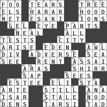 ACROSS 1. Egg _ yung 4. Rends 9. Relationship diagram 13. Raised railways 14. Ethiopian city, capital of Harari 15. Parka part 16. Was introduced to 17. 1973 Nobel Price Winner (Physics) Leo 18. Charged atoms 19. Set 21. Sight organ 22. Leg coverings 24. Anneal 26. Everything 27. Trials 29. Municipality 30. Ascend 31. Paradise 33. Leather borer 36. HTML Container Element 37. Contrary to your interests or welfare 40. Ocean 41. Observe 42. Monthly bill 43. Slender Brazilian palm 45. Ancient river in northeast Turkey 47. Bake eggs in their shells 48. Plant excrement 49. Observes 50. First name in cosmetics 52. Biblical high priest 54. R.R. building 56. Johnson of "Laugh-In" 57. Free of sound 59. Santa ___, CA 61. Austrian river, tributary to the Danube 62. Lacking originality or spontaneity 63. Lower and raise head in agreement 64. Habitations of wild animals 65. Tarsus (plural) 66. Small amount or degree DOWN 1. Opposite of masc. 2. Cassini of fashion 3. Clearly or manifestly demonstrative 4. Definite Article 5. Artist's stand 6. Like ___ of sunshine 7. Immoral or dissolute person 8. _ Lanka 9. Without viscosity 10. Carrot, for example 11. Immeasurably long periods of time 12. Begley and Asner 20. Allows 22. Aches 23. The first octave above the treble staff 25. Toward the sea 27. Small amounts or degrees 28. One of the Great Lakes 29. An absolute certainty 31. Nights before holidays 32. Lair 33. Helper 34. Erode 35. Den 38. Window treatment 39. Comfort 44. "______ My Girl" (Turtles hit) 45. Michaelmas daisies 46. Actress Charlotte 49. Beverly of Met fame 50. Celtic language 51. Comedian Laurel of Laurel & Hardy 52. Singer James 53. One who doesn't tell the truth 55. Small Philippine buffalo 56. Help 57. Fast jet (abbr.) 58. Flowery wreath 60. Increase