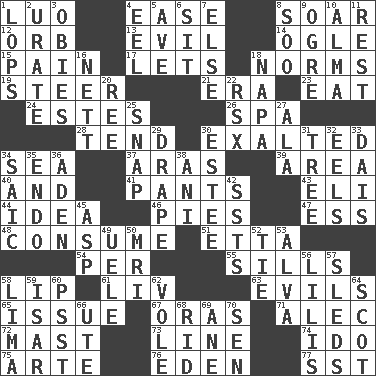 ACROSS 1. Nilotic language 4. Relaxation 8. Fly high 12. Globe 13. Morally bad or wrong 14. Stare at amorously 15. Ache 17. Allows 18. Typical standards 19. Navigate 21. Epoch 23. Ingest 24. _____ Park, CO 26. Health resort 28. Look after 30. Honored 34. Ocean 37. Ancient river in northeast Turkey 39. Type of rug 40. Added to 41. Leg coverings 43. Biblical high priest 44. It may be bright or harebrained 46. Sliced desserts 47. Double-curved letter 48. Eat 51. Singer James 54. For each 55. Beverly of Met fame 58. Mouth edge 61. 54 in ancient Rome 63. Vices 65. Come out of 67. Mouths or openings 71. Actor Baldwin 72. Vertical spar for supporting sails 73. Actor's bit 74. Wedding promise 75. Johnson of "Laugh-In" 76. Genesis locale 77. Fast jet (abbr.) DOWN 1. Chops off 2. A salt of uric acid 3. Off-Broadway awards 4. Snakelike fish 5. "___ Maria" 6. Be seated 7. Otherwise 8. "Barney Miller" actor Jack 9. Legendary monster 10. _ mater 11. Respite 16. Remaining after all deductions 18. California wine valley 20. Portuguese money of account (variant) 22. Acura sports coupe 25. Fastener 27. In the manner of 29. Window treatment 30. First name in cosmetics 31. Woody plant 32. Snakelike fish 33. Raised platform 34. Ketch in the Levant 35. Inside; within (prefix) 36. An important port of Yemen 38. Cuckoo 42. Fast planes 45. Viper 49. Ubangi River tributary 50. Medical imaging device (abbr.) 52. Standoff 53. Inventor's middle name 56. Ms. Damita and namesakes 57. Bobsleighs 58. Pale green bean 59. Austrian river, tributary to the Danube 60. Inconspicuous attention getter 62. Short-tailed, large-bodied rat 64. Native of Scotland 66. Shoshoni 68. To free from 69. One (Scot) 70. Elected rep.