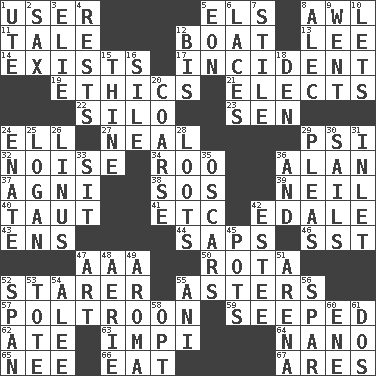 ACROSS 1. One who uses or employs something 5. Raised railways 8. Leather borer 11. Story 12. Water vessel 13. Area sheltered from the wind 14. Is extant 17. Event 19. Principles of right and wrong 21. Opts 22. Grain storage tower 23. Elected rep. 24. Pipe bend 27. Actress Patricia 29. Air pressure measure (abbr.) 32. Annoying sound 34. Friend of Pooh 36. ____ Jay Lerner 37. Hindu god of fire 38. Distress signal 39. Famous astronaut Armstrong 40. Strained 41. And so on (abbr.) 42. Peak District village in England 43. Followers of ems 44. Plant excrements 46. Fast jet (abbr.) 47. American Automobile Association (abbr.) 50. Round or rotation of duties 52. A viewer who gazes fixedly 55. Michaelmas daisies 57. Coward 59. Oozed 62. Had dinner 63. Body of Kaffir warriors 64. Billionth: prefix 65. Born 66. Ingest 67. Ancient Greek god of war DOWN 1. Shoshoni 2. Saxophone 3. Writer Wiesel 4. Musical pauses 5. A really long time 6. Shoestrings 7. Vertical member of a panel or frame 8. Actor Baldwin 9. Gone 10. Allows 12. Altar cloth linen 15. One or ones belonging to thee 16. Drop; flow; fall 18. Lair 20. Unrefined 24. Related on the mother's side 25. Utah city north of Ogden 26. "_ and Lucy" (Charlie Brown theme song) 28. Plunders 29. Entreaties 30. Travel by water 31. An arm off of a larger body of water 33. Be seated 35. Motion picture awards 36. Plus 42. First name in cosmetics 45. Plant holders 47. Tate display 48. Nest on high 49. Odor 51. Sports stadium 52. Connect, as a bridge 53. Haul 54. Toward shelter 55. Black tropical American cuckoo 56. Practice fight 58. Choose 60. Compass dir. 61. Two (Sp.)