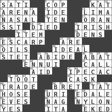 ACROSS 1. Suttee (variant) 5. Police officer (slang) 8. Krazy ___ of comics 11. Sports stadium 13. Binary compound 14. Pale green bean 15. Rhinal 16. Nine, plus one 17. Northwest Algerian city 18. Fast jet (abbr.) 19. Passed on 21. From or relating to Ireland 22. Detail 24. Habitations of wild animals 25. Fortification 27. "We ___ not amused" (Victoria) 29. Petroleums 30. Standard of perfection 32. Proofreading order 33. Tolerate 35. Blind as ____ 39. World-weariness 41. Give a ring to 42. Assist 43. Medicinal drug used to evoke vomiting 45. A blast of a horn 48. Keg 49. Buy and sell 50. Cy Young winner Saberhagen 52. Make lace 55. Flexible conduit 56. RI univ. 57. Peak District village in England 59. Nights before holidays 60. Tired old horse 61. Thermoplastic polyamide 62. Affirmative reply 63. Call ___ day 64. Supplemented with great effort DOWN 1. Without 2. Caspian sea tributary 3. One of the two male reproductive glands 4. _ tizzy (2 wds.) 5. Quote 6. Wrote a lyric poem 7. Fenced enclosure 8. Japanese brewing company 9. Collect or gather 10. Hyperbolic tangent 12. Tree or shrub in the Birch family 14. Old wives' tales, e.g. 20. Mischievous child 21. The main thing one is thinking about 23. Clothes sense 25. Greek goddess of the dawn 26. Be seated 27. Increase 28. To sift 30. One more than two 31. Shoestrings 33. Black tropical American cuckoo 34. Partially opened flower 36. Sass 37. Insect wing 38. Affectionate concern, for short 40. Nathan's nickname 43. Frozen water 44. Eucharist need 45. Collection of objects 46. Fertile tracts in a desert 47. Lyric poems 49. Those things 50. Naughty child 51. Port city in Latvia 53. Medicinal plant 54. Be inclined (to) 56. Single; one (prefix) 58. Color