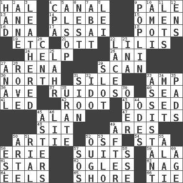 ACROSS 1. Actor Linden 4. Lessep's creation 9. Diluted with white 13. One (Scot) 14. First-year military academy student 15. Presage 16. Heredity factor (abbr.) 17. Slender Brazilian palm 18. Plant holders 19. And so on (abbr.) 21. Baseball player Mel 22. Ms. Damita and namesakes 24. Assist 26. Cuckoo 27. Sports stadium 29. Skim 30. _ pole 31. Filth; sediment 33. Electrical Unit 36. "___ Maria" 37. Noisy, rowdy, vocal (Spanish) 40. Ocean 41. Directed 42. Carrot, for example 43. Administered medicine 45. Actor Alda or Thicke 47. Proofreads 48. Be seated 49. Ancient Greek god of war 50. Nick name for Arthur 52. Order of Saint Francis (abbr.) 54. R.R. building 56. One of the Great Lakes 57. Sets of matching outer garments 59. According to 61. Play the lead 62. Stares 63. Tired old horse 64. Snakelike fish 65. Dinah or Pauly 66. Standoff DOWN 1. Possessed 2. Singer Murray 3. Resembling or made to resemble leather 4. Tax preparer (abbr.) 5. Columnist Joseph or Stewart 6. A home for chicks 7. Blind as ____ 8. Flowery wreath 9. Cotton for raincoats, e.g. 10. Mine, in Marseilles 11. Allows 12. Followers of ems 20. Penny 22. Shoestrings 23. _ tizzy (2 wds.) 25. Cowardly lion portrayer 27. Of or related to the anus 28. Be footloose 29. Narrow opening 31. The Jewish people; Israel 32. Wedding promise 33. Helper 34. Rendezvous 35. Groovy apts. 38. A salt of uric acid 39. Baltic tributary 44. Lyric poems 45. Michaelmas daisies 46. Cards in a Roman deck? 49. Following 50. Johnson of "Laugh-In" 51. Monetary unit of Yemen 52. Ending for "Through" and "Enough" 53. Grain storage tower 55. Mountain range southwest of Kyrgyzstan 56. Compass dir. 57. Distress signal 58. Compass dir. 60. Mature