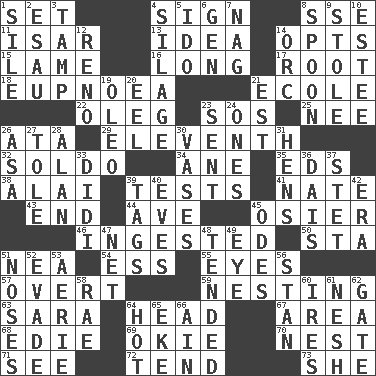 ACROSS 1. Arrange properly for use 4. Signal 8. Compass dir. 11. Austrian river, tributary to the Danube 13. The content of cognition 14. Chooses 15. Unable to walk 16. Yearn 17. Carrot, for example 18. Normal relaxed breathing 21. Learning spot: Fr. 22. Cassini of fashion 23. Mayday 25. Born 26. "One Day ___ Time" 29. Veterans Day date 32. Twentieth part of a lira 34. A saturated hydrocarbon 35. Begley and Asner 38. Jai ____ 39. Trials 41. Nathan's nickname 43. Conclusion 44. "___ Maria" 45. Flexible twig of a willow tree 46. Eaten 50. R.R. building 51. Teachers' org. 54. Double-curved letter 55. Snake ____ (dice throw) 57. Unconcealed 59. Snuggling 63. "Two Mules for Sister ____" 64. Froth on beer 67. Length times width 68. Singer Brickell 69. Migrant worker of the '30s 70. Egg locale 71. Perceive with the eye 72. Be inclined (to) 73. A female animal or person DOWN 1. Drop; flow; fall 2. He sold his birthright 3. Pack (down) 4. Fodder prepared in a silo 5. Wedding promise 6. Commissioned military rank (abbr.) 7. Tired old horse 8. Soup utensil 9. Took without asking 10. First name in cosmetics 12. Former U.S. Attorney General Janet 14. The grampus (Milton) 19. Margarine 20. Snakelike fish 21. Eastern Standard Time (abbr.) 23. Emitted 24. Singles 26. White ___ sheet 27. Lacquered or enameled metalware 28. Actor Alda or Thicke 30. Flower holders 31. Coop moms 33. "You Light Up My Life" star Conn 36. Raised platform 37. Proofreading order 39. Labels 40. Nights before holidays 42. Period 45. Lyric poems 47. Fish or hair follower 48. Looked after 49. Sight organ 51. Olfactory organs 52. Elude 53. Nest on high 56. Comedian Laurel of Laurel & Hardy 58. Actress Charlotte 60. Angers 61. Tender 62. Yard entry 64. Being at a high temperature 65. Make supply last 66. The 18th letter of the Arabic alphabet