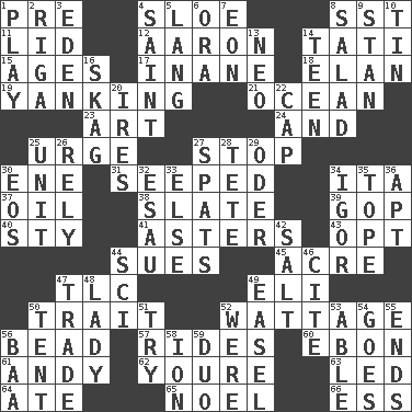 ACROSS 1. Before (prefix) 4. A type of plum 8. Fast jet (abbr.) 11. Hat (slang) 12. Composer Copland 14. Jacques of French films 15. Eons 17. Silly 18. Liveliness 19. Pulling on something suddenly 21. Sea 23. Tate display 24. Plus 25. Goad 27. Obstruct or block passage 30. Compass dir. 31. Oozed 34. Call ___ day 37. Lubricate 38. Chalkboard 39. Republican Party 40. Filthy place 41. Michaelmas daisies 43. Elect 44. Takes to court 45. Land measure 47. Affectionate concern, for short 49. Biblical high priest 50. Distinguishing feature 52. Electrical Measurement 56. Necklace unit 57. Amusement-park features 60. Inky black, to poets 61. Actor Griffith 62. You are 63. Directed 64. Had dinner 65. Christmas carol 66. Curvy letter DOWN 1. Romp 2. Port city in Latvia 3. Genesis locale 4. Inhabitant of Heaven 5. Austrian-born American filmmaker Fritz 6. Mouth or opening 7. Period of immesurable duration 8. First course 9. Comedian Laurel of Laurel & Hardy 10. Metal container 13. Modern: prefix 14. Adolescent 16. Heroin 20. Angers 22. Head covering 25. A single undivided whole 26. Trust 27. Arguments over trivial matters 28. Wig 29. River in Europe 30. Greek goddess of the dawn 32. He sold his birthright 33. Otherwise 34. Russian composer Stravinsky 35. Drink excessively 36. Fitting 42. Table seasoning 44. _-fi 46. Quote 47. Barter 48. Kenny Rogers chart-topper in '80 49. Artist's stand 50. Portable shelter 51. Attempt 52. We are 53. Competent 54. Moves 55. Conclusions 56. Sound made by sheep 58. Electrically charged atom 59. Superhero pair