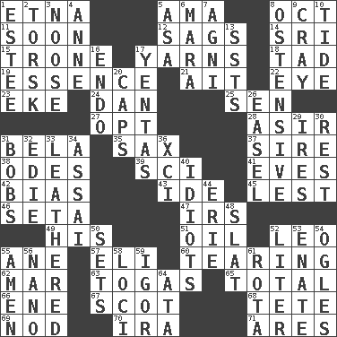 ACROSS 1. Inactive volcano in Sicily 5. Nanny (var.) 8. Sep. follower 11. Within a short period 12. Sinks 14. _ Lanka 15. Heavy duty weighing machine 17. Tall tales 18. Small amount or degree 19. Substance 21. Small island 22. Sight organ 23. Supplement with great effort 24. Daniel's nick name 25. Elected rep. 27. Elect 28. SW Saudi Arabia district 31. Actor Lugosi 35. Saxophone 37. Father 38. Lyric poems 39. _-fi 41. Nights before holidays 42. Prejudice 43. Binary compound 45. For fear that 46. Bristle 47. Big collection agency 49. Part of HMS, perhaps 51. Lubricate 52. Lion 55. One (Scot) 57. Connecticut Ivy Leaguer 60. Pulling apart 62. Make imperfect 63. Ancient Roman robes 65. Add up to 66. Compass dir. 67. Highlander 68. Wig 69. Lower and raise head in agreement 70. Retirement account (abbr.) 71. Ancient Greek god of war DOWN 1. First name in cosmetics 2. Cod relative 3. Trap for birds or small mammals 4. Singer Murray 5. White ___ sheet 6. Hindu Mythology: god of death 7. Hindu god of fire 8. Clearly or manifestly demonstrative 9. Supercomputer manufacturer 10. Periodic rise and fall of the sea level 13. Fast planes 16. Inside; within (prefix) 17. Gossips 20. Balmoral and tarboosh 26. Artist's stand 29. Angers 30. Relief 31. Moves up and down 32. Singer Brickell 33. Tough but pliablecoriaceous 34. Slender Brazilian palm 36. One more than ninety 40. Foolish or stupid persons 44. 4th largest of the Great Lakes 48. Narrow board 50. Arranges properly for use 52. 61 cubic inches 53. Related on the mother's side 54. Stares at amorously 55. So be it 56. Billionth: prefix 58. Venues 59. Russian composer Stravinsky 61. Round or rotation of duties 64. "One Day ___ Time"