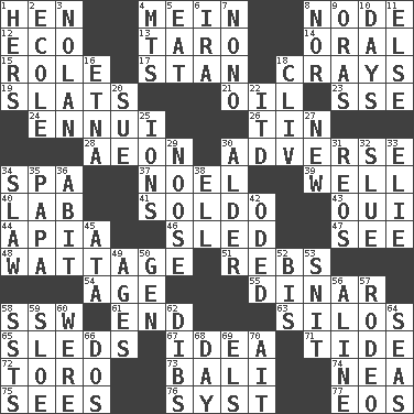 ACROSS 1. Layer 4. Chow _ 8. Thickened enlargement 12. Environmental prefix 13. Pacific island yam 14. Of the mouth 15. Hero or heavy, e.g. 17. Comedian Laurel of Laurel & Hardy 18. Trading vessels 19. Narrow boards 21. Petroleum 23. Compass dir. 24. World-weariness 26. Metal container 28. A really long time 30. Contrary to your interests or welfare 34. Health resort 37. Christmas carol 39. Water source 40. Experiment locale 41. Twentieth part of a lira 43. Fr. "Yes" 44. Capital of Western Samoa 46. Downhill vehicle 47. Perceive with the eye 48. Electrical Measurement 51. Confederate soldiers (slang) 54. Ripen 55. Middle Eastern gold or silver currency 58. Compass dir. 61. Conclude 63. Grain storage towers 65. Bobsleighs 67. It may be bright or harebrained 71. Event that recurs at intervals 72. "Corrida" creature 73. Indonesian resort city 74. Teachers' org. 75. Perceives with the eye 76. System (abbr.) 77. Greek goddess of the dawn DOWN 1. Possessive pronoun 2. Learning spot: Fr. 3. Pitcher Ryan 4. Mountains (abbr.) 5. Consume 6. Retirement account (abbr.) 7. Words to Nanette 8. Or not 9. Mouths or openings 10. 24-hour periods 11. Otherwise 16. Inactive volcano in Sicily 18. 154 in Roman numerals 20. Take to court 22. It would 25. Charged particles 27. ___ Haven, CT 29. Trap for birds or small mammals 30. Tree or shrub in the Birch family 31. Vintage cars 32. Change direction abruptly 33. Writer Wiesel 34. Cole _ (cabbage dish) 35. Dad 36. "This won't hurt ____!" 38. Pipe bend 42. Wrote a lyric poem 45. _ moment's notice (2 wds.) 49. Matures 50. Commissioned mil. rank 52. Twice 53. In a ____ (agitated or irritated) 56. Place in a line 57. Cowboy competition 58. Fast planes 59. A type of plum 60. We are 62. Rights 64. Oceans 66. Two (Sp.) 68. 24 hours 69. Raised railways 70. Small island