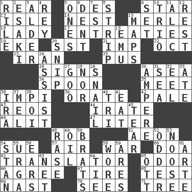 ACROSS 1. Rump 5. Lyric poems 9. Play the lead 13. Capri or Wight 14. A home for chicks 15. Haggard of country music 16. Kenny Rogers chart-topper in '80 17. Pleas 19. Supplement with great effort 20. Fast jet (abbr.) 21. Mischievous child 22. Sep. follower 23. SW Asia republic 25. Suppuration 26. Attaches a signature 30. Toward the sea 34. Soup utensil 35. Rendezvous 36. Body of Kaffir warriors 39. Speak pompously 42. Light colored 43. Vintage cars 44. Feeling or showing extreme anger 46. Set down 47. 61 cubic inches 48. Director Reiner 51. Period of immesurable duration 54. Take to court 57. Atmosphere 58. Armed conflict 60. ___ good deed 62. Interpreter 65. Scent 66. Match 67. Become fatigued 68. Trial 69. Political cartoonist Thomas 70. Perceives with the eye 71. Woody plant DOWN 1. Cause heat under the collar 2. 1973 Nobel Price Winner (Physics) Leo 3. Tree or shrub in the Birch family 4. Marina Del _, California 5. Singles 6. Scratch 7. Eastern Standard Time (abbr.) 8. Empty completely 9. Put into a specified state 10. Musical group of three 11. Actor Baldwin 12. Remainder 15. Atlas contents 18. Australian flightless bird 20. Clip 24. Help 27. Thick or sticky substance 28. Or not 29. Slow-paced one 30. Electrical Unit 31. Ocean 32. Snakelike fish 33. Had dinner 36. Retirement account (abbr.) 37. Cartoonist voice _ Blanc 38. Luau course 40. Three (prefix) 41. Ingest 45. Lacerate 48. Raze (variant) 49. Lubricate 50. Naughty children 52. More peculiar 53. Trap for birds or small mammals 54. Comedian Laurel of Laurel & Hardy 55. Capital and largest city of Mongolia 56. Hearing organs 58. Had on 59. Ancient Greek god of war 61. Johnson of "Laugh-In" 63. Fish or hair follower 64. Neckwear 65. Baseball player Mel