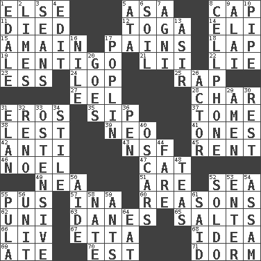 ACROSS 1. Otherwise 5. White ___ sheet 8. Head covering 11. Passed on 12. Ancient Roman robe 14. Connecticut Ivy Leaguer 15. At full speed 17. Aches 18. Infant locale 19. Small, flat, pigmented spot on the skin 21. Cards in a Roman deck? 22. Falsehood 23. Curvy letter 24. Trim (branches) 25. Reproach for some lapse or misdeed 27. Snakelike fish 28. Burn to charcoal 31. Greek god of love 35. Small drink 37. Heavy book 38. For fear that 39. Modern: prefix 41. Washington bills 42. Opposed to 43. Science/research agcy. 45. Monthly bill 46. Christmas carol 47. Domesticated feline 49. Teachers' org. 51. "We ___ not amused" (Victoria) 52. Ocean 55. Suppuration 57. _ tizzy (2 wds.) 60. Thinks logically 62. Corn or form start 63. Natives or inhabitants of Denmark 65. Table seasonings 66. 54 in ancient Rome 67. Singer James 68. The main thing one is thinking about 69. Had dinner 70. Eastern Standard Time (abbr.) 71. Dormintory (informal) DOWN 1. Peak District village in England 2. Citrus fruits 3. Actors Connery and Penn 4. Prepare for publication 5. "One Day ___ Time" 6. The visible part of the earth's surface 7. Hindu god of fire 8. Portable communications device 9. Mountain range southwest of Kyrgyzstan 10. Corncob 13. SW Saudi Arabia district 16. Mediterranean tributary 17. Cotton for raincoats, e.g. 20. Moves 26. Thespian 29. So be it 30. Repose 31. Liveliness 32. Western Nevada city 33. Clearly or manifestly demonstrative 34. Vertical member of a panel or frame 36. Fenced enclosure 40. Motion picture awards 44. Conductor's collection 48. Beverages made from leaves 50. Helper 52. Twentieth part of a lira 53. Keyboard key 54. Indian state 55. Monetary unit of Botswana 56. A single undivided whole 58. Nathan's nickname 59. Pismires 61. Stated 64. Ingest