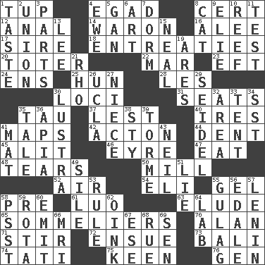 ACROSS 1. Uncastrated adult male sheep 4. Mild oath 8. An absolute certainty 12. Of or related to the anus 14. Make _____ (do battle with) 16. Toward shelter 17. The founder of a family 18. Pleas 20. Carrier 22. Impair 23. Bank Draft (abbr.) 24. Followers of ems 25. Attila the _ 28. French article 30. Event scenes 31. Theater features 35. The 19th letter of the Greek alphabet 37. For fear that 40. Angers 41. Atlas contents 42. NE Massachussets city 44. Scratch 45. Set down 46. Jane of fiction 47. Consume 48. Lacerates 50. Place where flour is made 52. Atmosphere 54. Connecticut Ivy Leaguer 55. Set 58. Before (prefix) 61. Nilotic language 63. Dodge 65. Wine waiters 70. ____ Jay Lerner 71. Agitate 72. Take place subsequently 73. Indonesian resort city 74. Jacques of French films 75. Peachy ____! 76. Commissioned military rank (abbr.) DOWN 1. Clothes sense 2. The state of being joined or united 3. Actors' quests 4. She-sheep 5. Separate the seeds from cotton 6. Tate display 7. Dormintory (informal) 8. Feline 9. Writer Wiesel 10. Coral collection 11. Trial 13. Area sheltered from the wind 15. Anneal 19. Ancient Greek god of war 21. 17th letter of the Greek alphabet 26. Southern CA. univ. 27. Sibling's daughter 29. Beer mug 30. A period of five years 32. Length times width 33. Portable shelter 34. Fast jet (abbr.) 35. Lie 36. Capital of Western Samoa 38. Filthy place 39. Singer Mel 41. Floor covering 43. Famous astronaut Armstrong 49. Drop; flow; fall 51. Untruth 53. Court order 55. Russian prison camp 56. Peak District village in England 57. Soviet premier 1918-24 58. Inconspicuous attention getter 59. Round or rotation of duties 60. Give off 62. Pig sound 64. Experiment locale 66. Medical imaging device (abbr.) 67. Compass dir. 68. Regret 69. Elected rep.