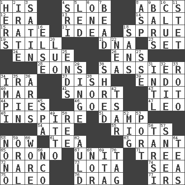 ACROSS 1. Part of HMS, perhaps 4. Oscar Madison type 8. Lettered men learn these first 12. Epoch 13. French philosopher Descartes 14. Table seasoning 15. Assign a rank or rating to 17. It may be bright or harebrained 18. Disorder 19. Not moving 21. Heredity factor (abbr.) 23. Arrange properly for use 24. Follow as a consequence or result 26. Followers of ems 28. Immeasurably long periods of time 30. More impudent 34. Lyricist Gershwin 37. Food container 39. Inside; within (prefix) 40. Make imperfect 41. Derisive sound 43. Teat (slang) 44. Sliced desserts 46. Leaves 47. Lion 48. Stimulate to action 51. Moist 54. Had dinner 55. Disturbances 58. Immediately 61. Afternoon social gathering 63. Let have 65. U. of Maine site 67. A single undivided whole 71. Family _ (genealogy) 72. Drug cop 73. Globular water bottle used in Asia 74. Ocean 75. Margarine 76. To trail on the ground 77. Big collection agency DOWN 1. Possessive pronoun 2. Feeling or showing extreme anger 3. Smooth fabric 4. Indian title of respect (Mr.) 5. Directed 6. Single 7. Necklace unit 8. Cleo's killer 9. Drinking establishments 10. A slight indication 11. Proofreading order 16. Otherwise 18. Without 20. Nilotic language 22. Teachers' org. 25. Conclusions 27. Compass dir. 29. Scorch 30. Fragment 31. International (abbr.) 32. Singer Brickell 33. Printing process, for short 34. Body of Kaffir warriors 35. Water falling in drops from the sky 36. Ancient Greek god of war 38. "Barney Miller" actor Jack 42. Russian ruler of old 45. Health resort 49. "Tell ____ the Marines!" 50. Portuguese money of account (variant) 52. Russian fighter aircraft 53. Left side of a ship or aircraft 56. Tarsus (plural) 57. Contemptuous expression 58. Words to Nanette 59. Spoken 60. Had on 62. Old (Scot.) 64. Afternoon social gatherings 66. Non-commissioned officer (abbr.) 68. And not 69. Call ___ day 70. Label