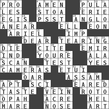 ACROSS 1. Adept person 4. So be it 8. Monetary unit of Botswana 12. French article 13. Portico 14. 4th largest of the Great Lakes 15. Armor plate that protects the chest 17. Inconspicuous attention getter 18. White American of non-Hispanic descent 19. Approach 21. Pipe bend 23. Age 24. Satellite of Uranus 26. Naughty child 28. Letter starter 30. Lacerating 34. Expire 37. Quote 39. Arab leader 40. Working for oneself (abbr.) 41. You are 43. Wing 44. Skim 46. Trial 47. Affirmative reply 48. Devices for capturing images 51. Needle case 54. Rowing implement 55. Indian state 58. Fitting 61. _-fi 63. Having ears or earlike features 65. Clothes sense 67. Distinctive style or manner 71. Printing process, for short 72. Brightly colored fish 73. 1/640 square mile 74. Cartoonist voice _ Blanc 75. Female horse 76. Sense of smell 77. Nonscientific branch of learning DOWN 1. Entreaty 2. Canadian anthropologist Darnell 3. Flexible twig of a willow tree 4. Cleo's killer 5. Mountains (abbr.) 6. Greek goddess of the dawn 7. Nathan's nickname 8. Animal enclosure 9. Goad 10. _ and Stitch 11. Period of immesurable duration 16. Expressed in words 18. _ mater 20. Portuguese money of account (variant) 22. Whopper 25. Made of lace 27. Before (prefix) 29. Debaucheries 30. Laconic 31. "If ____ say so..." 32. "Death on the ____" 33. Pate de foie ____ 34. Compact _ 35. South American Indian 36. Dutch treat 38. Third day of the wk. 42. Singer James 45. Modern: prefix 49. Raze (variant) 50. Curve 52. Purpose 53. Austrian river, tributary to the Danube 56. Odor 57. Distance measurement 58. Tiny particle 59. Dad 60. Russian ruler of old 62. _ the terrible 64. Dunce 66. Definite Article 68. Environmental prefix 69. Big collection agency 70. Born