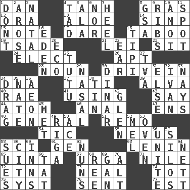 ACROSS 1. Daniel's nick name 4. Hyperbolic tangent 8. Pate de foie ____ 12. Mouth or opening 13. _ vera 14. Simple or foolish person 15. Brief written record 17. Have the gumption 18. Off limits 19. Sadhe (variant) 21. Luau accessory 23. Be seated 24. Opt 26. Fitting 28. Part of speech 30. Popular '50s hangout 34. Heredity factor (abbr.) 37. Jacques of French films 39. Inventor's middle name 40. Actress Charlotte 41. Putting into practice 43. Declare 44. Smallest unit of an element 46. Of or related to the anus 47. Followers of ems 48. Commissioned military rank 51. San ____ (Riviera town) 54. Nervous spasm 55. Mole, birthmark 58. _-fi 61. Commissioned military rank (abbr.) 63. Soviet premier 1918-24 65. National forest in Provo, Utah 67. Capital and largest city of Mongolia 71. Mediterranean tributary 72. Inactive volcano in Sicily 73. Actress Patricia 74. Small child 75. System (abbr.) 76. Transmitted 77. Eastern Standard Time (abbr.) DOWN 1. Do not 2. Came up 3. Brizilian seaport 4. Bit 5. According to 6. Not either 7. The bottom of a shoe or boot 8. Girls' org. (abbr.) 9. Chest bones 10. Mine, in Marseilles 11. Blemish 16. Genesis locale 18. Native american tent (variation) 20. Environmental prefix 22. Ewer handle 25. Ballerina skirt 27. Federal power corp. 29. Relating to the nose 30. Middle Eastern gold or silver currency 31. Otherwise 32. _ the terrible 33. Negative votes 34. To trail on the ground 35. Nathan's nickname 36. A really long time 38. Metal container 42. Small, secluded valley 45. Was introduced to 49. Capital of Latvia 50. Adept person 52. Cartoonist voice _ Blanc 53. Baking chamber 56. Join together 57. Grain storage towers 58. Takes to court 59. Municipality 60. Taverns 62. Religious women 64. Remaining after all deductions 66. Make lace 68. To separate or throw off 69. Separate the seeds from cotton 70. Keyboard modifier key