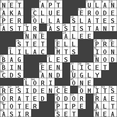ACROSS 1. Fish or hair follower 4. Fitting 7. Uhlan (variant) 11. Alias (abbr.) 12. A slight indication 13. Wear away 14. For each 15. Spanish pot 16. Chalkboards 17. Being in motion 19. Helper 21. Compass dir. 23. Toward shelter 24. Proofreading order 25. Pipe bend 26. Before (prefix) 29. Pale purple color 30. Mountains (abbr.) 31. Electrically charged atom 32. Paper or plastic container 33. French article 34. Allow head to fall sleepily 35. Storage container 36. Car or cant ending 37. It is permitted: Lat. 40. Music discs 41. Also 42. Unsightly 43. Australian parrot (variant) 45. Single 46. Dwelling 51. Leaves out 55. Declaimed 56. Aroma 58. Actress Charlotte 59. Carrier 60. Corncob 61. The first octave above the treble staff 62. SW Saudi Arabia district 63. Arrange properly for use 64. Teachers' org. DOWN 1. California wine valley 2. Makes supply last 3. Small pie 4. Everything 5. Monetary unit of Botswana 6. Afternoon social gatherings 7. A salt of uric acid 8. Globular water bottle used in Asia 9. An important port of Yemen 10. Egg locale 12. Pupil covering 13. Otherwise 16. Beverly of Met fame 18. International (abbr.) 20. Table seasonings 22. And so on (abbr.) 24. Public displays of written messages 25. Make improvements or corrections to 26. Abounding in pines 27. Carrot, for example 28. Conclusion 29. Put down 32. English channel? 33. Soviet premier 1918-24 36. Having ears or earlike features 37. Nilotic language 38. Fail to notice 39. Clement's nick name 43. 61 cubic inches 44. River in Europe 46. Roll call or roster of names 47. Greek god of love 48. Suttee (variant) 49. 911 reaches them 50. Singer Brickell 52. SW Asia republic 53. Story 54. Stalk of a moss capsule 57. Elect