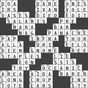 ACROSS 1. ___ good deed 4. Have the gumption 8. Singles 12. Big collection agency 13. _ the terrible 14. Short-tailed, large-bodied rat 15. Flower holders 18. Passed on 19. Prepare for publication 20. Deli grouping 22. Before (prefix) 23. Hindu Mythology: god of death 24. Drinking establishment 25. Tired old horse 26. Flamboyance 30. Infant food 33. Kind of red light 36. Son of Odin 37. Silent film actress Nazimova 39. RI univ. 40. Snakelike fish 41. South Vietnam president (1954) 42. Dwarf 44. To riddle 45. Paper fasteners 47. Untruth 50. Period of immesurable duration 51. Fast planes 53. Attempt 54. Pertaining to the sea 57. Type of rug 59. Opera by Verdi 61. More uncommon 63. Protracted 64. Riding implement 65. Compass dir. 66. Carryall 67. Hearing organs 68. Filthy place DOWN 1. HTML Container Element 2. Mouths or openings 3. Indian state 4. "You Light Up My Life" star Conn 5. Deliberation 6. Actress Charlotte 7. Conclude 8. Make much ado about nothing 9. Thickened enlargement 10. Connecticut Ivy Leaguer 11. Arrange properly for use 16. Enthusiasm 17. "Two Mules for Sister ____" 21. Wise men 22. Baking dish 24. Sound made by sheep 26. Demure 27. "Mermaids" star 28. Hollow 29. Celtic language 30. Groovy apts. 31. Set down 32. Entreaty 34. Religious women 35. Away 38. Electrical Measurement 42. Commissioned mil. rank 43. Otherwise 46. Myrna of the movies 48. Austrian river, tributary to the Danube 49. Inactive volcano in Sicily 52. Founders of families 53. Portable shelter 54. Scent 55. Balmoral and tarboosh 56. Penny 57. Keyboard modifier key 58. Friend of Pooh 59. Adept person 60. Retirement account (abbr.) 62. Marina Del _, California