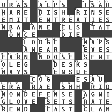 ACROSS 1. Mouths or openings 5. High mountains 9. Russian ruler of old 13. Female horse 14. Food container 15. Remove soap 16. Give off 17. Pleas 19. Basketball assoc. 20. A saturated hydrocarbon 21. Raised railways 22. Make lace 23. At one time in the past 25. Pass on 26. Inn 30. Atlas contents 34. Approach 35. Nights before holidays 36. Merit 39. Trap for birds or small mammals 42. Transmitted 43. Cassini of fashion 44. Writing tables 46. Negative votes 47. Follow as a consequence or result 48. Gear tooth 51. Son of Isaac 54. Period 57. Actress Charlotte 58. Quiet! 60. To free from 62. Unrelated to defense, as in spending 65. Hindu god of fire 66. Michael Jackson trademark 67. Puts into a specified state 68. Pace 69. Tear apart 70. 90 degrees 71. Dollar (slang) DOWN 1. Presage 2. Role for Stallone 3. Believer in; advocate of (suffix) 4. Arrange properly for use 5. An important port of Yemen 6. Actor's bit 7. Pacific Standard Time (abbr.) 8. Fragment 9. Teat (slang) 10. In a ____ (agitated or irritated) 11. Toward the sea 12. Relief 15. Raze (variant) 18. Connecticut Ivy Leaguer 20. A really long time 24. Rigngs loudly 27. Lair 28. E Mali city 29. Eat (away) 30. Makes clutter 31. "___ Maria" 32. Animal enclosure 33. Fast jet (abbr.) 36. A really long time 37. Wing 38. Marina Del _, California 40. Elected rep. 41. Double-curved letter 45. Malaysian steamed pastry 48. Algonquian 49. Clumsy lout 50. Honkers 52. Therefore, facetiously 53. National forest in Provo, Utah 54. Engineer (abbr.) 55. Hero or heavy, e.g. 56. At once, immediately (arch.) 58. Fast planes 59. Behest 61. South Vietnam president (1954) 63. Movie disc 64. Teachers' org. 65. Curve