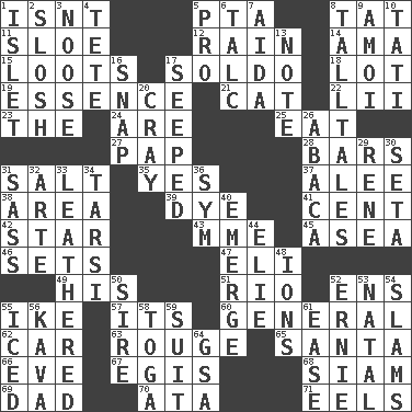ACROSS 1. Is not 5. Parent Teacher Association (abbr.) 8. Make lace 11. _ gin 12. Water falling in drops from the sky 14. Nanny (var.) 15. Plunders 17. Twentieth part of a lira 18. Car dealer's back yard 19. Gist 21. Feline 22. Cards in a Roman deck? 23. Definite Article 24. "We ___ not amused" (Victoria) 25. Consume 27. Infant food 28. Taverns 31. Table seasoning 35. It is so 37. Toward shelter 38. Type of rug 39. Color 41. Penny 42. Play the lead 43. Madame (abbr.) 45. Toward the sea 46. Arranges properly for use 47. Biblical high priest 49. Part of HMS, perhaps 51. River (Sp.) 52. Followers of ems 55. Mamie's mate 57. It is 60. Commissioned military rank 62. Auto 63. Makeup applied to the cheeks 65. Before Barbara or Clara 66. First lady 67. Armor plate that protects the chest 68. Thailand, formerly 69. June honoree 70. "One Day ___ Time" 71. Snakelike fish DOWN 1. Small island 2. Agitate, as a liquid 3. Trap for birds or small mammals 4. Wig 5. Adept person 6. Baby powder 7. Opera by Verdi 8. Baron Munchausen's specialties 9. Mine, in Marseilles 10. Jacques of French films 13. Brief written record 16. Fastener 17. Oozed 20. Supercomputer manufacturer 26. Phillipine bananalike plant 29. French philosopher Descartes 30. Bristle 31. Backtalk 32. Johnson of "Laugh-In" 33. Tough but pliablecoriaceous 34. Tarsus (plural) 36. Symbol (abbr.) 40. Develop 44. Writer Wiesel 48. Charged particles 50. Father 52. Bert's buddy 53. Relating to or accompanying birth 54. Shuts with force 55. On the rocks 56. Polynesian shrub of the pepper family 58. Ancient Roman robe 59. Set of matching outer garments 61. Comfort 64. Girls' org. (abbr.)