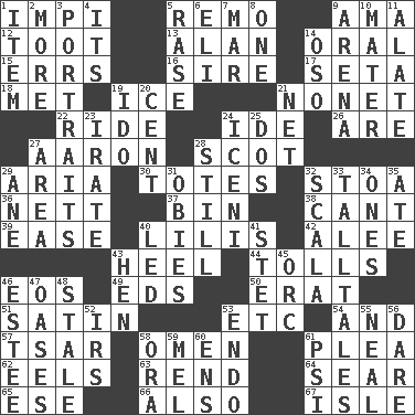 ACROSS 1. Body of Kaffir warriors 5. San ____ (Riviera town) 9. Nursemaid (var.) 12. A blast of a horn 13. Actor Alda or Thicke 14. Relating to the mouth 15. Blunders 16. Title for a man of rank and authority 17. Stalk of a moss capsule 18. Was introduced to 19. Frozen water 21. Music written for nine 22. Travel on an animal 24. Binary compound 26. "We ___ not amused" (Victoria) 27. Composer Copland 28. Highlander 29. Operatic vocal solo 30. Hauls 32. Portico 36. Remaining after all deductions 37. Storage container 38. Patter 39. Comfort 40. Ms. Damita and namesakes 42. Toward shelter 43. Person who is morally reprehensible 44. For Whom the Bell _____ 46. Greek goddess of the dawn 49. Begley and Asner 50. Part of Q.E.F. 51. Smooth fabric 53. And so on (abbr.) 54. Added to 57. Russian ruler of old 58. Sign of something about to happen 61. Entreaty 62. Snakelike fish 63. Tear apart 64. Shrivel 65. Compass dir. 66. In addition 67. Capri or Wight DOWN 1. A whole individual unit 2. Greater amount 3. Likenesses of persons 4. It is 5. To erase 6. Connecticut Ivy Leaguer 7. Third mo. 8. Single 9. Sports stadium 10. Mother 11. Having winglike extensions 14. Bear (Spanish) 19. Wedding promise 20. Penny 21. Fish or hair follower 23. Feeling or showing extreme anger 24. Ancient Celtic tribe of eastern Britain 25. Two (Sp.) 27. Length times width 28. Free of sound 29. One (Scot) 31. Off-Broadway awards 32. Any of the three canals of the cochlea 33. Baron Munchausen's specialties 34. Singles 35. Had dinner 40. Directed 41. Proofreading order 43. Layer 45. The grampus (Milton) 46. First name in cosmetics 47. Fertile tracts in a desert 48. Lacking originality or spontaneity 52. Big collection agency 53. Inside; within (prefix) 55. Anneal 56. Have the gumption 58. Mouth or opening 59. Cartoonist voice _ Blanc 60. Followers of ems 61. Air pressure measure (abbr.)