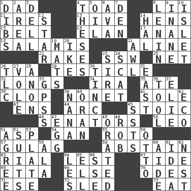 ACROSS 1. June honoree 4. Frog relative 8. Cards in a Roman deck? 11. Angers 13. Hub of activity 14. Coop moms 15. Waist strap 16. Flair 17. Of or related to the anus 18. Deli grouping 21. Place in a line 22. Immoral or dissolute person 23. Compass dir. 25. Fish or hair follower 26. Federal power corp. 29. One of the two male reproductive glands 32. Yearns 34. Retirement account (abbr.) 35. Had dinner 38. Hoof sound 39. Music written for nine 41. Not divided or shared with others 43. Followers of ems 44. Curve 45. Unemotional 46. Elected representatives 50. Lion 51. Viper 54. Separate the seeds from cotton 55. Printing process, for short 57. Russian prison camp 59. Refrain by choice 63. Monetary unit of Yemen 64. For fear that 67. Periodic rise and fall of the sea level 68. Singer James 69. Otherwise 70. Lyric poems 71. Compass dir. 72. Downhill vehicle 73. Ingest DOWN 1. Rights 2. Length times width 3. Small valley 4. College papers 5. Petroleum 6. Actress Gardner 7. Lair 8. Soviet premier 1918-24 9. Empty; void 10. Small island 12. Play the lead 14. Actor Linden 19. Floor coverings 20. D.D.E's nickname 21. Leather borer 23. Male parent of an animal 24. Go away! 26. Affectionate concern, for short 27. Grand slam 28. At once, immediately (arch.) 30. A color or tint 31. Compass direction 33. Global Positioning Systems (abbr.) 36. Implement 37. Writer Wiesel 39. Nanny 40. Northwest Algerian city 42. Environmental prefix 45. Fast planes 47. Oval reproductive body of a fowl 48. Spoke pompously 49. Director Reiner 51. Match 52. Costumes for special activities 53. Food holder 56. "Beetle Bailey" pooch 58. In the manner of 60. Helper 61. The content of cognition 62. A home for chicks 64. French article 65. Pipe bend 66. Compass dir.
