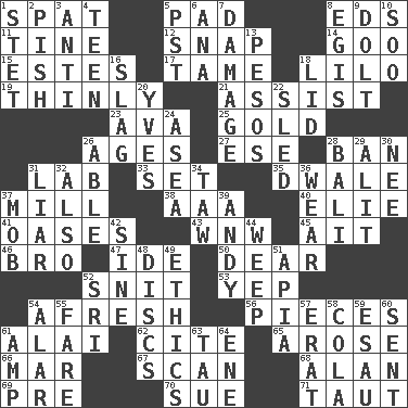 ACROSS 1. Petty quarrel 5. Groovy apt. 8. Begley and Asner 11. Prong on a fork 12. Fastener 14. Thick or sticky substance 15. _____ Park, CO 17. Not wild 18. _ and Stitch 19. Without force or sincere effort 21. Help 23. Actress Gardner 25. Precious metal 26. Grows older 27. Compass dir. 28. Forbid 31. Experiment locale 33. Arrange properly for use 35. A sleeping potion; an opiate (poet.) 37. Place where flour is made 38. Auto club (abbr.) 40. Writer Wiesel 41. Fertile tracts in a desert 43. Compass dir. 45. Small island 46. Sis' sibling 47. Binary compound 50. Letter starter 52. In a ____ (agitated or irritated) 53. Slangy assent 54. Anew 56. Parts 61. Mountain range southwest of Kyrgyzstan 62. Quote 65. Came up 66. Impair 67. Examine hastily 68. ____ Jay Lerner 69. Before (prefix) 70. Take to court 71. Tense DOWN 1. Proofreading order 2. Expression of disdain 3. Against 4. Adolescent 5. Pacific Standard Time (abbr.) 6. Santa ___, CA 7. Break 8. The front part of a cuirass 9. Dunce 10. "Barney Miller" actor Jack 13. Mexican monetary units 16. Volcanic refuse 18. Flaplike covering 20. Jacques Cousteau's middle name 22. Downhill vehicle 24. Toward the sea 26. Competent 28. Indonesian resort city 29. Came down and settled, as after flight 30. Born 31. One who doesn't tell the truth 32. In addition 34. The 23rd letter of the Hebrew alphabet 36. Erode 37. Disorderly crowd 39. "60 Minutes" Commentator Rooney 42. Trig term 44. Shed a tear 48. Flat circles 49. Moral principles 51. Capital of Western Samoa 52. _ Lanka 54. Having or resembling wings 55. Conductor's collection 57. Part of Q.E.F. 58. Root beer relative 59. He sold his birthright 60. Posted 61. Electrical Unit 63. The 19th letter of the Greek alphabet 64. Compass dir.