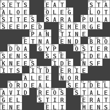 ACROSS 1. Puts into a specified state 5. Ingest 8. R.R. building 11. _ vera 12. Cassini of fashion 14. Car dealer's back yard 15. Settings 17. "Two Mules for Sister ____" 18. Monetary unit of Botswana 19. Oozed 21. Develop 23. Baking dish 25. Prong on a fork 26. Inactive volcano in Sicily 27. Conclude 28. Sis' sibling 31. ___ good deed 33. Flimflam 35. Flexible twig of a willow tree 37. Elected reps. 38. Compass dir. 40. The content of cognition 41. Leg joints 43. Binary compound 45. Overdraft (abbr.) 46. ___ a Wonderful Life 47. It would 50. 4th largest of the Great Lakes 52. Toward shelter 53. Not either 54. Severe or trying experience 56. Beer mug 61. Enthusiastic 62. Vintage cars 65. Lacking originality or spontaneity 66. Set 67. Agitate 68. Part of Q.E.F. 69. Compass dir. 70. Connecticut Ivy Leaguer 71. Not women's DOWN 1. Backtalk 2. Writer Wiesel 3. Carryall 4. Ooze 5. Greek goddess of the dawn 6. Wing 7. Cylindrical with tapered ends 8. Snaillike creature with no shell 9. Lacquered or enameled metalware 10. "One Day ___ Time" 13. Street urchin 16. Back-to-school mo. 18. Before (prefix) 20. Mild oath, euphamism for damn 22. Inside; within (prefix) 24. Negative votes 26. Relaxation 28. Auction offers 29. Coral collection 30. Mouth or opening 31. Scratch 32. Singles 34. 23rd letter of the Greek alphabet 36. Trig term 37. What Jean-Claude Killy likes to do 39. Genesis locale 42. Filth; sediment 44. Greek god of love 48. Pulls into pieces 49. Erase 51. Angers 52. Say or write further 54. Baking chamber 55. Cause heat under the collar 57. A distinct part 58. Have the gumption 59. Style 60. Allows 61. Grow older 63. Lubricate 64. _ Lanka