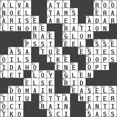 ACROSS 1. Inventor's middle name 5. Had dinner 8. Friend of Pooh 11. Christmas carol 12. Scottish caps 14. Period 15. Originate 17. Collude with 18. The sixth month of the Jewish calendar 19. Poe poem 21. Food allowance for one day 23. Actress Charlotte 25. Take by theft 26. Inconspicuous attention getter 27. Snakelike fish 28. Compass dir. 31. White ___ sheet 33. Third day of the wk. 35. _____ Park, CO 37. Petroleums 38. Mamie's husband 40. I made a mistake 41. Potato state 43. Compass dir. 45. Choose 46. Allow 47. Myrna of the movies 50. Small, secluded valley 52. Otherwise 53. To free from 54. Realm 56. Artist's stands 61. Ballerina skirt 62. Singer James 65. Distance measurement 66. Sep. follower 67. Water falling in drops from the sky 68. Opposed to 69. Ring climax 70. _-fi 71. Backtalk DOWN 1. Of or related to the anus 2. Old wives' tales, e.g. 3. Distinctive style or manner 4. In addition 5. "One Day ___ Time" 6. Bar bill 7. Develop 8. Make new 9. Northwest Algerian city 10. Rowing implement 13. Having lost freshness 16. Blunders 18. Direct toward a target or goal 20. 90 degrees 22. Lacquered or enameled metalware 24. Needle case 26. Romantic infatuation 28. Close up, plug up 29. Back-to-school mo. 30. Double-curved letter 31. Assistant 32. Narrow board 34. Supplement with great effort 36. Within a short period 37. Petroleum 39. Engineer (abbr.) 42. Rounded earthenware pot or jar 44. Writer Wiesel 48. Flexible twig of a willow tree 49. Gossips 51. Dutch treat 52. Australian flightless bird 54. Evade 55. Von Bismarck 57. Oceans 58. Inactive volcano in Sicily 59. Allows 60. Indian titles of respect 61. Small child 63. Nervous spasm 64. Black tropical American cuckoo