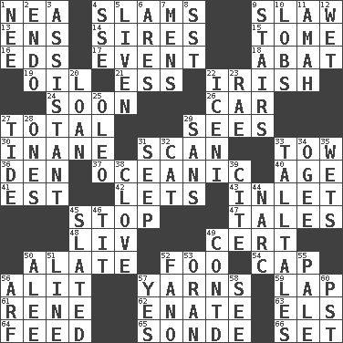 ACROSS 1. Teachers' org. 4. Shuts with force 9. Cole _ (cabbage dish) 13. Followers of ems 14. Fathers 15. Heavy book 16. Begley and Asner 17. Incident 18. Blind as ____ 19. Petroleum 21. Curvy letter 22. From or relating to Ireland 24. Within a short period 26. Auto 27. Add up to 29. Observes 30. Lacking in sense or substance 31. Glance over 33. Pull behind 36. Lair 37. Pertaining to the sea 40. Personal question 41. Eastern Standard Time (abbr.) 42. Allows 43. An arm off of a larger body of water 45. Discontinue 47. Stories 48. 54 in ancient Rome 49. Certainty 50. Having winglike extensions 52. Egg _ yung 54. Head covering 56. Came down and settled, as after flight 57. Tall tales 59. Infant locale 61. French philosopher Descartes 62. Related on the mother's side 63. Raised railways 64. Nourish 65. Something which is sent 66. Put into a specified state DOWN 1. Born 2. Inside; within (prefix) 3. Aide 4. Compass dir. 5. Make or become more lively 6. Ancient Greek god of war 7. Not women's 8. Fast jet (abbr.) 9. Flight of steps 10. Tennis shots 11. Nanny 12. Dripping 20. Grant temporary use of 22. Ancient Celtic tribe of eastern Britain 23. Actress Charlotte 25. Margarine 27. Periodic rise and fall of the sea level 28. Singles 29. Without 31. Ooze 32. Domesticated feline 33. Baron Munchausen's specialties 34. Double curve, resembling the letter S 35. Moistens 38. Garlic unit 39. Quote 44. Drug cop 45. Scheduled 46. Teat (slang) 49. Continued (abbr.) 50. Toward shelter 51. Actor's bit 52. Papal veil 53. Northwest Algerian city 55. Light colored 56. Sandy's bark 57. Affirmative reply 58. Observe 60. Pacific Standard Time (abbr.)